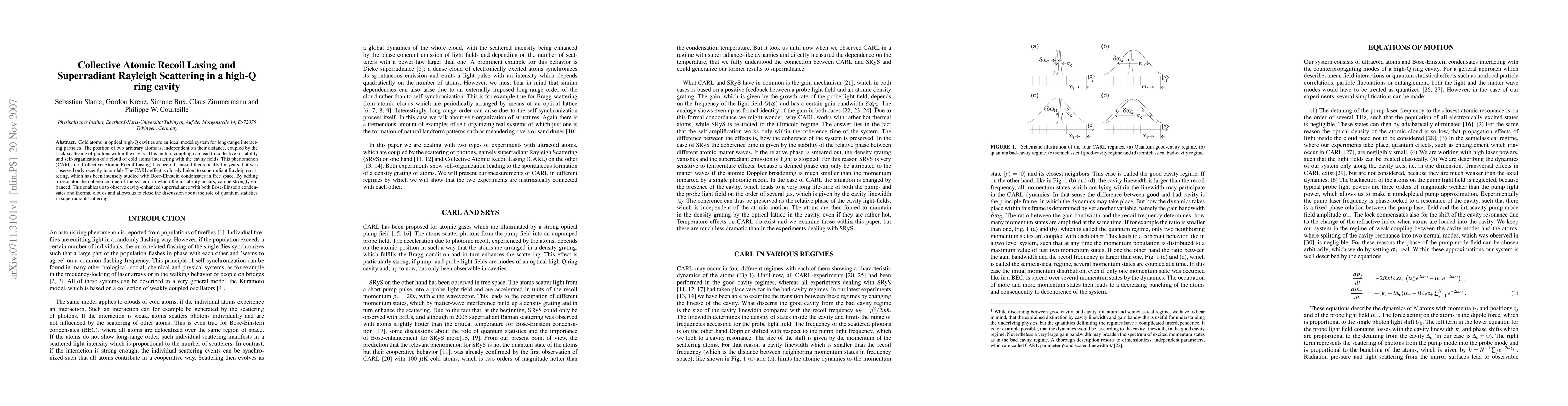 This paper reports the observation of Collective Atomic Recoil Lasing (CARL) in a high-Q ring cavity, showing how cold atoms interact and self-organize through mutual photon back-scattering. The enhanced coherence time in the cavity also enables the study of cavity-enhanced superradiant Rayleigh scattering, providing insights into the role of quantum statistics in superradiant phenomena.
