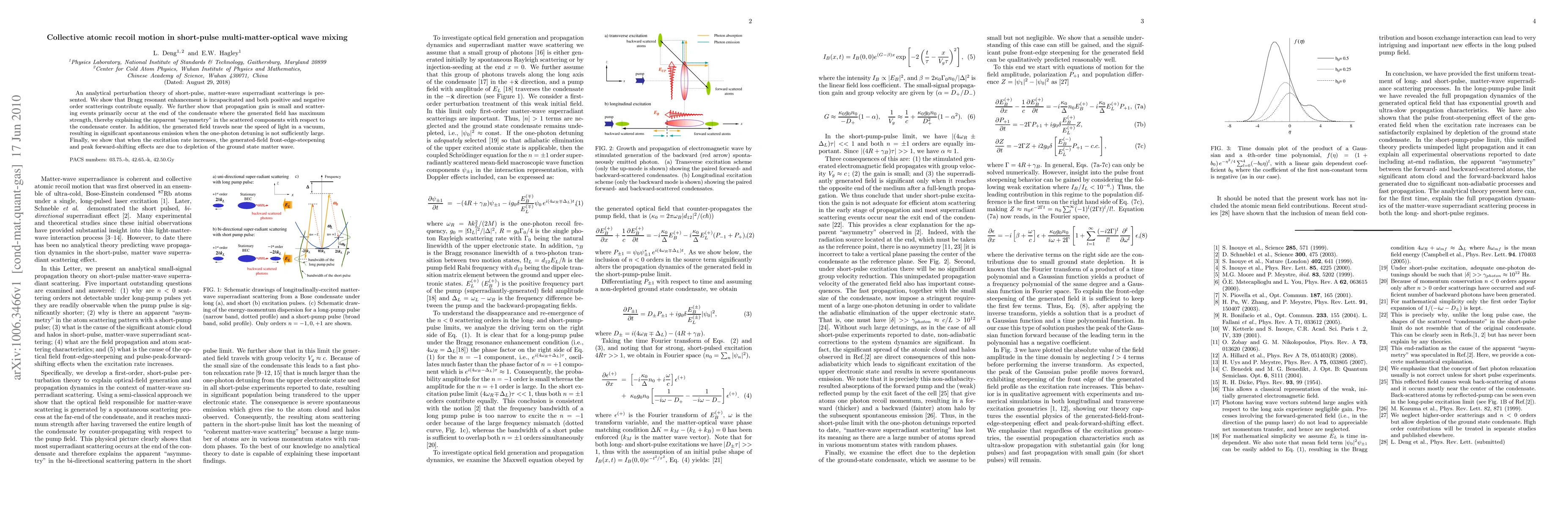 An analytical perturbation theory of short-pulse, matter-wave superradiant scatterings is presented. We show that Bragg resonant enhancement is incapacitated and both positive and negative order scatterings contribute equally. We further show that propagation gain is small and scattering events primarily occur at the end of the condensate where the generated field has maximum strength, thereby explaining the apparent ``asymmetry" in the scattered components with respect to the condensate center. In addition, the generated field travels near the speed of light in a vacuum, resulting in significant spontaneous emission when the one-photon detuning is not sufficiently large. Finally, we show that when the excitation rate increases, the generated-field front-edge-steepening and peak forward-shifting effects are due to depletion of the ground state matter wave.