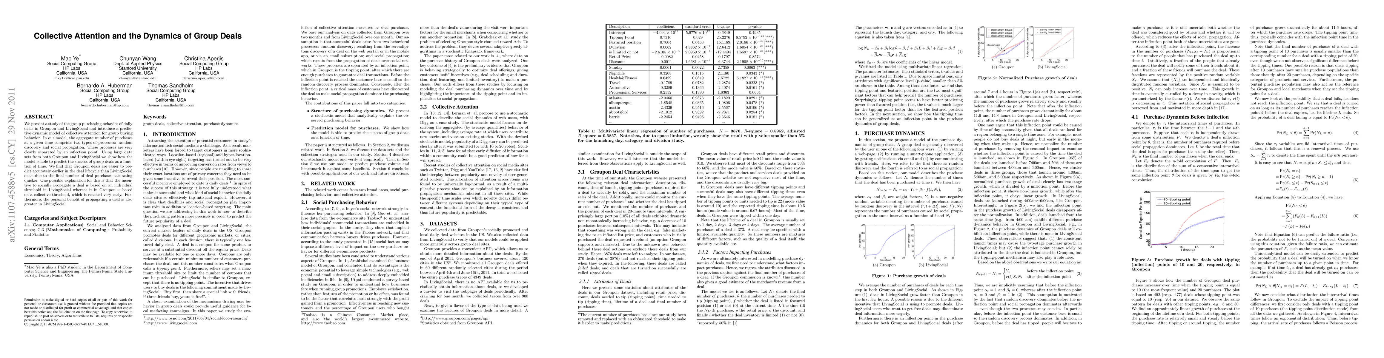 A study on Groupon and LivingSocial daily deals found that a predictive model of collective attention can accurately predict deal success over time. The model shows that Groupon deals are easier to predict earlier due to differences in individual vs. collective thresholds and personal incentives.