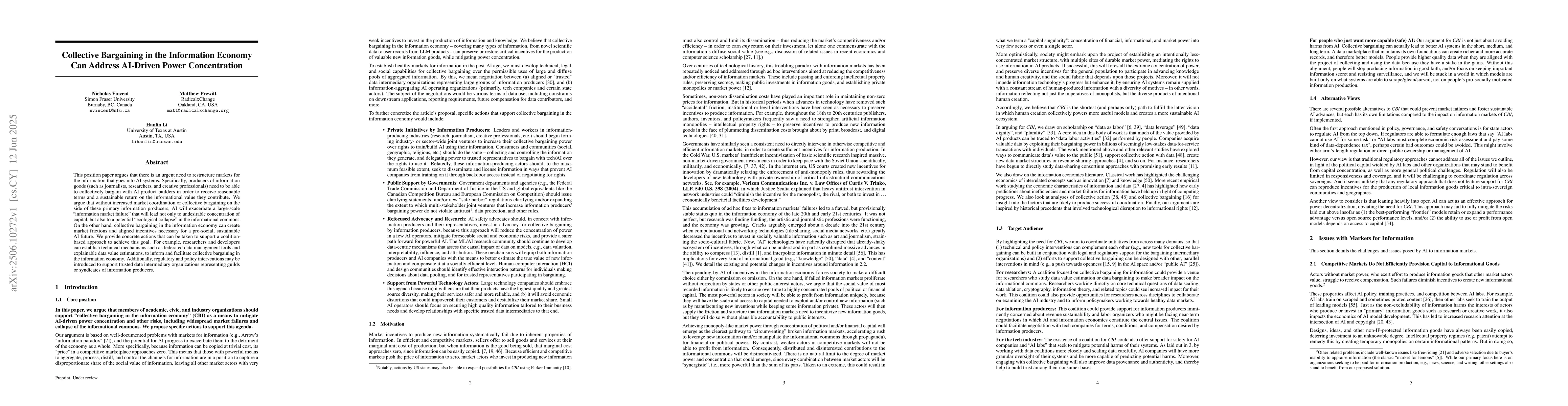 This position paper argues that there is an urgent need to restructure markets for the information that goes into AI systems. Specifically, producers of information goods (such as journalists, researchers, and creative professionals) need to be able to collectively bargain with AI product builders in order to receive reasonable terms and a sustainable return on the informational value they contribute. We argue that without increased market coordination or collective bargaining on the side of these primary information producers, AI will exacerbate a large-scale "information market failure" that will lead not only to undesirable concentration of capital, but also to a potential "ecological collapse" in the informational commons. On the other hand, collective bargaining in the information economy can create market frictions and aligned incentives necessary for a pro-social, sustainable AI future. We provide concrete actions that can be taken to support a coalition-based approach to achieve this goal. For example, researchers and developers can establish technical mechanisms such as federated data management tools and explainable data value estimations, to inform and facilitate collective bargaining in the information economy. Additionally, regulatory and policy interventions may be introduced to support trusted data intermediary organizations representing guilds or syndicates of information producers.