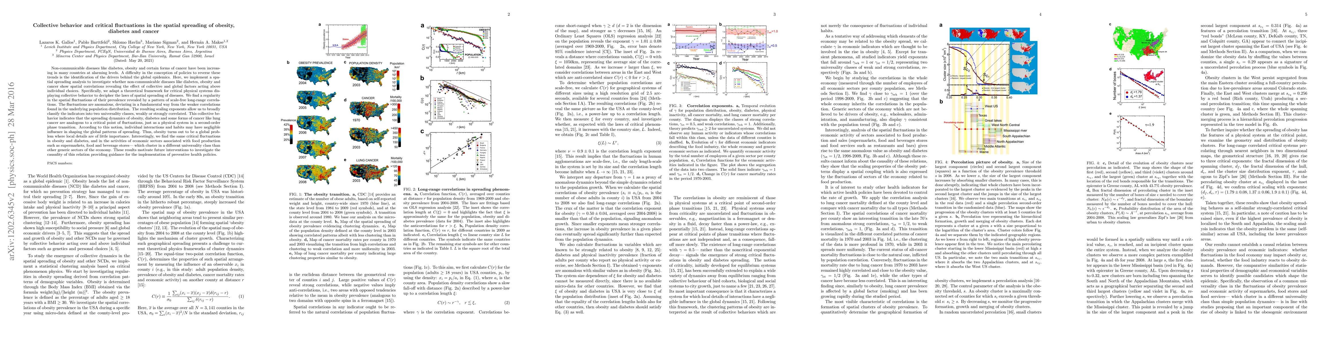 Non-communicable diseases like diabetes, obesity and certain forms of cancer have been increasing in many countries at alarming levels. A difficulty in the conception of policies to reverse these trends is the identification of the drivers behind the global epidemics. Here, we implement a spatial spreading analysis to investigate whether diabetes, obesity and cancer show spatial correlations revealing the effect of collective and global factors acting above individual choices. We adapt a theoretical framework for critical physical systems displaying collective behavior to decipher the laws of spatial spreading of diseases. We find a regularity in the spatial fluctuations of their prevalence revealed by a pattern of scale-free long-range correlations. The fluctuations are anomalous, deviating in a fundamental way from the weaker correlations found in the underlying population distribution. This collective behavior indicates that the spreading dynamics of obesity, diabetes and some forms of cancer like lung cancer are analogous to a critical point of fluctuations, just as a physical system in a second-order phase transition. According to this notion, individual interactions and habits may have negligible influence in shaping the global patterns of spreading. Thus, obesity turns out to be a global problem where local details are of little importance. Interestingly, we find the same critical fluctuations in obesity and diabetes, and in the activities of economic sectors associated with food production such as supermarkets, food and beverage stores--- which cluster in a different universality class than other generic sectors of the economy. These results motivate future interventions to investigate the causality of this relation providing guidance for the implementation of preventive health policies.