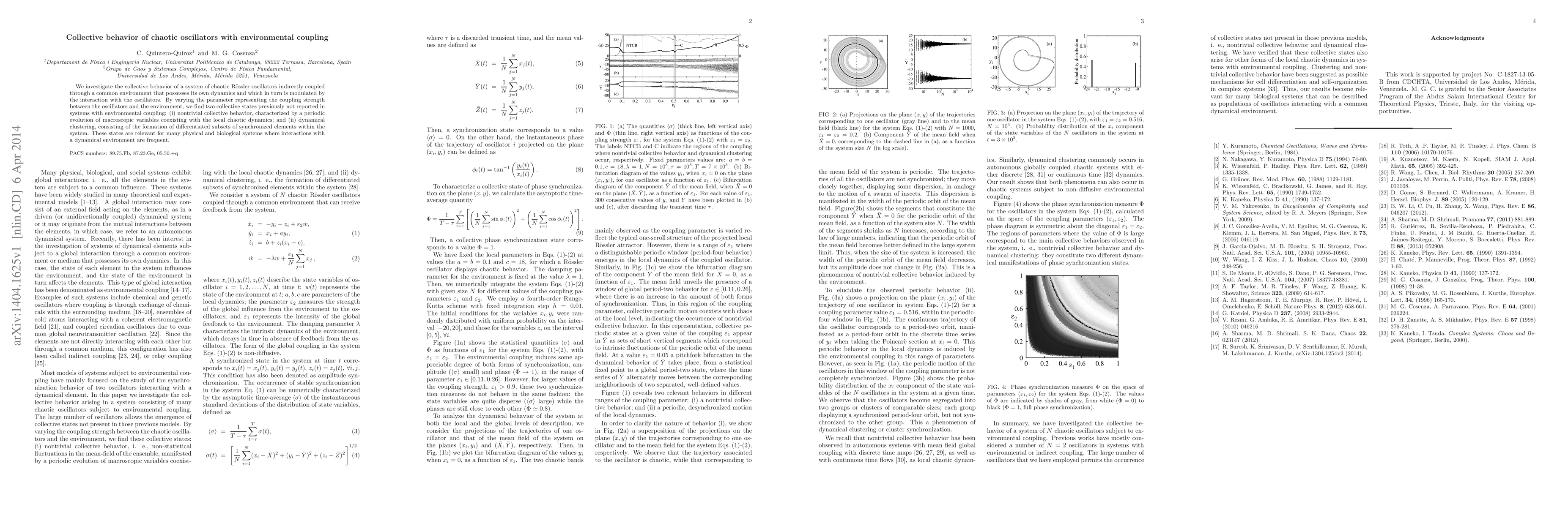 This paper explores the collective dynamics of chaotic Rössler oscillators coupled via a shared environment, revealing two novel states: periodic macroscopic evolution amidst local chaos, and dynamical clustering with synchronized subsets. These findings are significant for systems with environmental interactions.