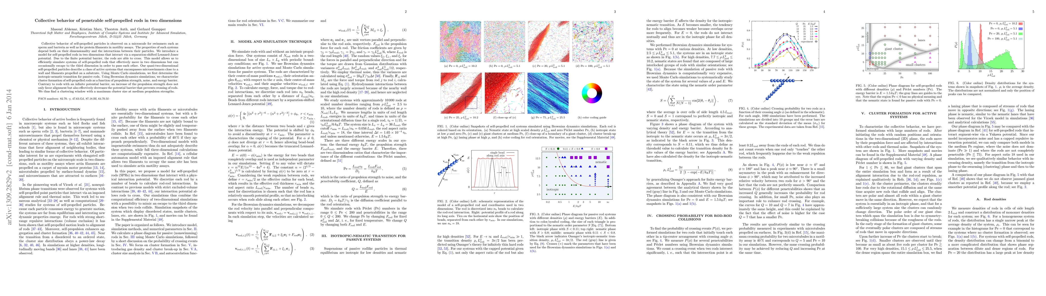 This paper models self-propelled rods in two dimensions that can occasionally escape to the third dimension to pass each other, simulating systems of such rods using Monte Carlo and Brownian dynamics methods. It finds that increased propulsion strength not only favors alignment but also lowers the barrier preventing rod crossing, leading to a clustering window with maximal cluster size at medium propulsion strengths.