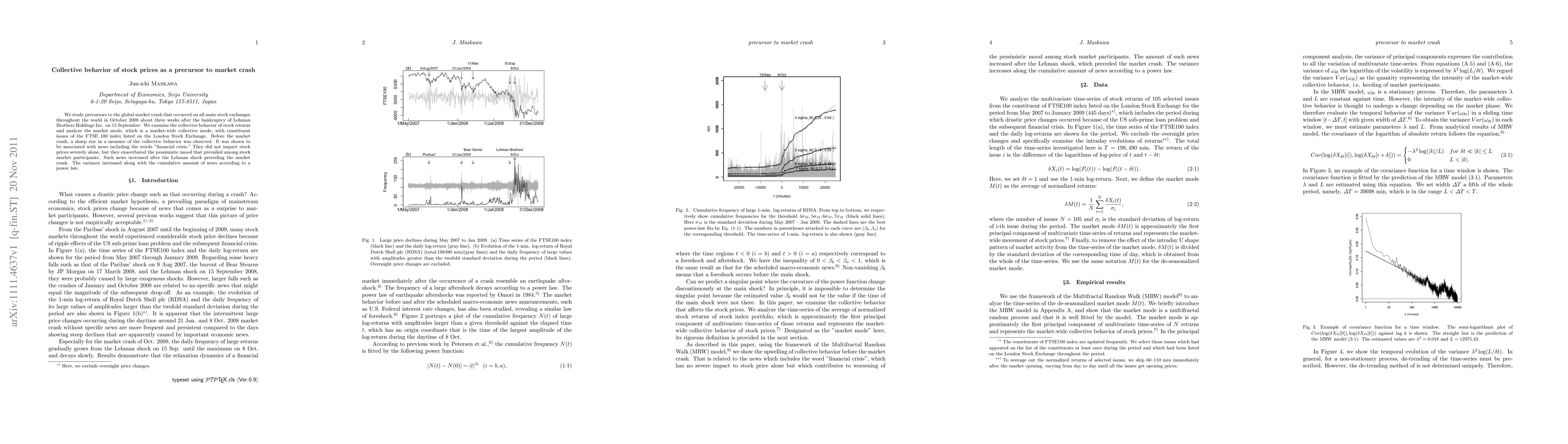 This paper investigates the collective behavior of stock prices preceding the 2008 global market crash, focusing on the FTSE 100 index. It finds a sharp rise in collective behavior measures, linked to news mentioning "financial crisis," which intensified the market's pessimistic mood and contributed to the eventual crash.