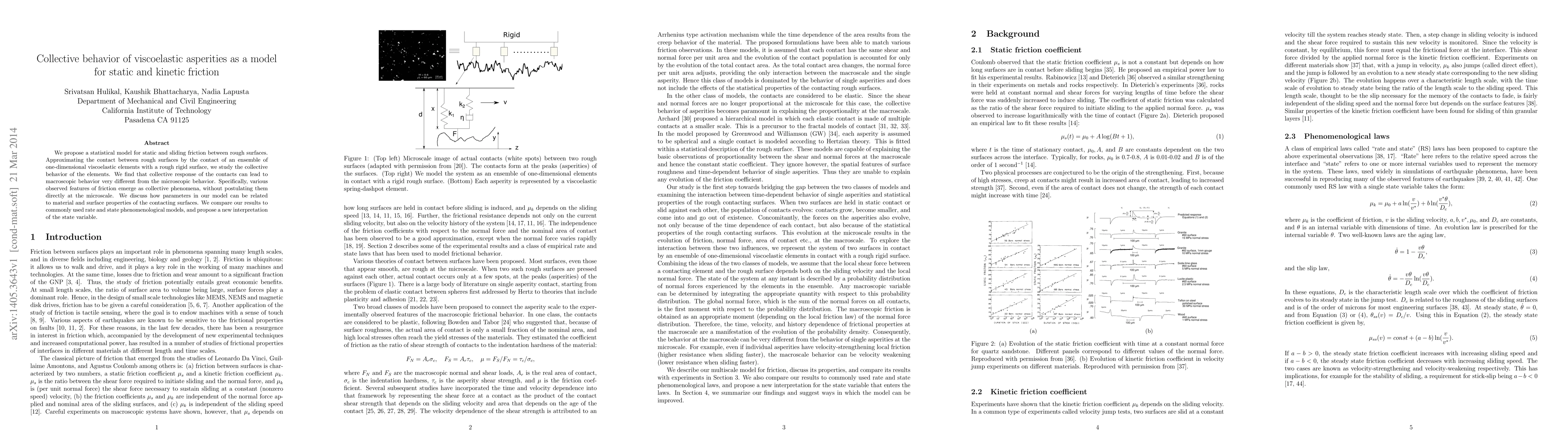 This paper proposes a statistical model for static and kinetic friction, showing that collective behavior of viscoelastic elements mimicking surface asperities can explain observed friction phenomena without microscale assumptions. It relates model parameters to material and surface properties and offers a new interpretation of the state variable in friction models.