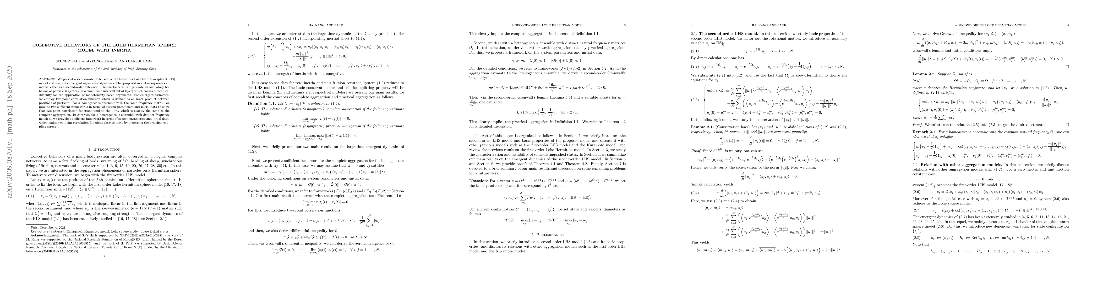 Researchers extend a hermitian sphere model to study collective behavior with inertia, finding that it can exhibit oscillatory behavior in small time intervals for homogeneous ensembles, but converges to complete aggregation for heterogeneous ensembles.