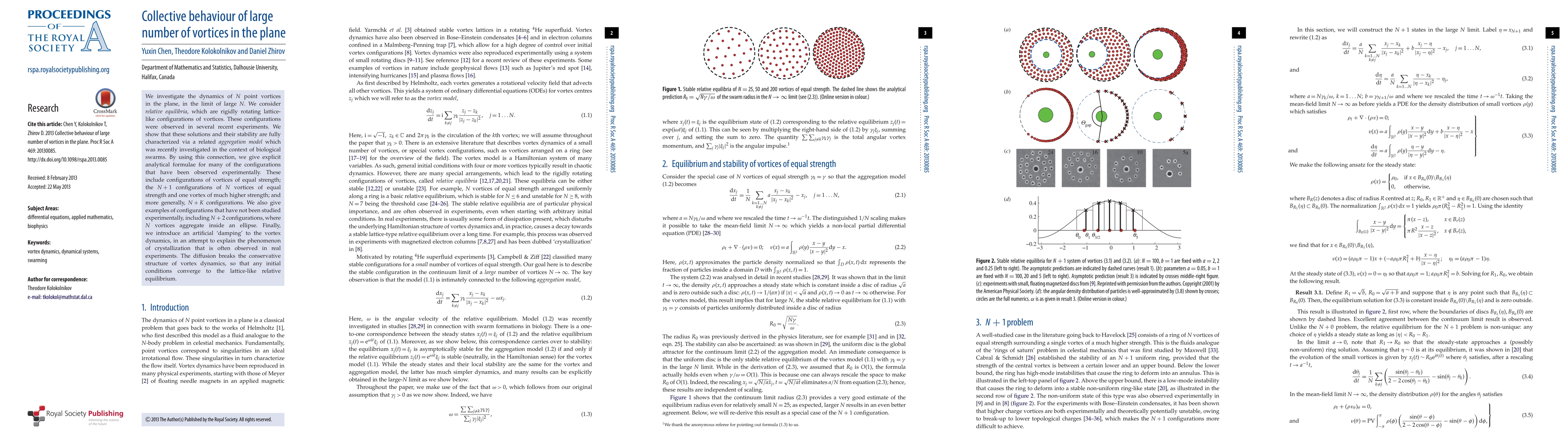 This paper investigates the collective dynamics and stability of large point vortex systems in a plane, revealing lattice-like configurations via an aggregation model akin to biological swarms. It provides explicit analytic solutions for various observed and novel configurations, introducing artificial damping to explain experimental crystallization phenomena.