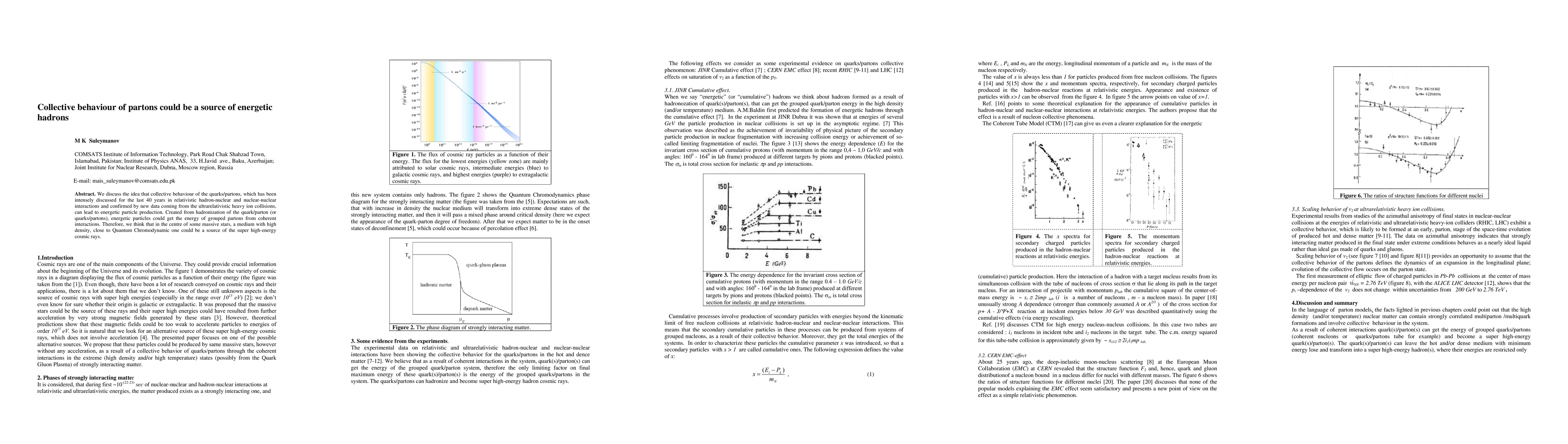 We discuss the idea that collective behaviour of the quarks/partons, which has been intensely discussed for the last 40 years in relativistic hadron-nuclear and nuclear-nuclear interactions and confirmed by new data coming from the ultrarelativistic heavy ion collisions, can lead to energetic particle production. Created from hadronization of the quark/parton (or quarks/partons), energetic particles could get the energy of grouped partons from coherent interactions. Therefore, we think that in the centre of some massive stars, a medium with high density, close to Quantum Chromodynamic one could be a source of the super high-energy cosmic rays.