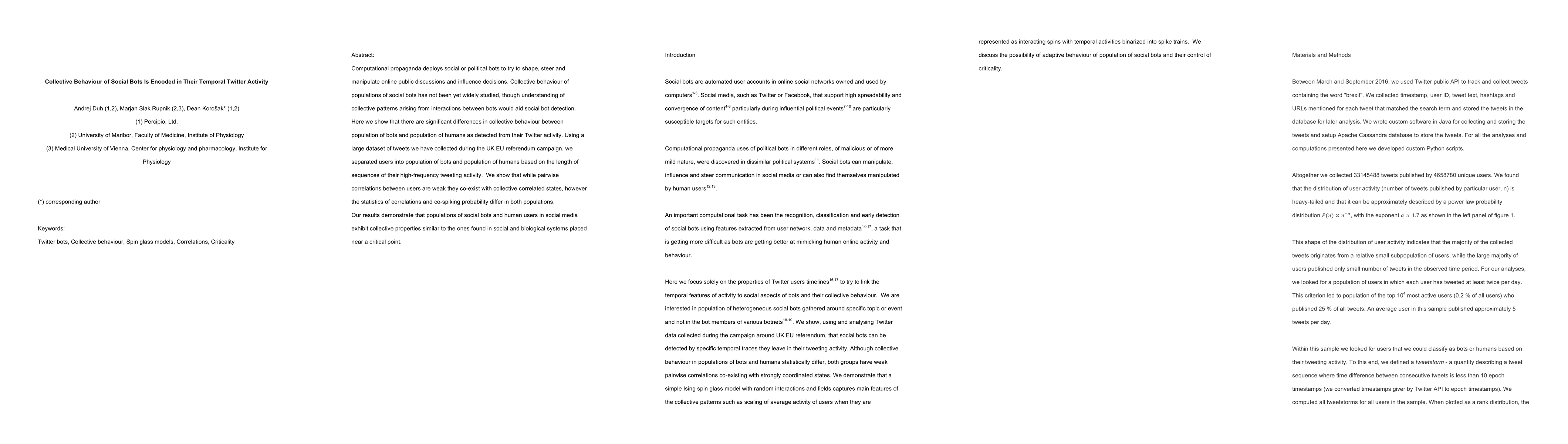 This study investigates the collective behavior of social bots on Twitter during the UK EU referendum campaign, revealing distinct patterns in their temporal activity compared to human users. The research highlights significant differences in the statistics of correlations and co-spiking probability between bot and human populations, suggesting that social bots exhibit collective properties akin to those found in critical social and biological systems.