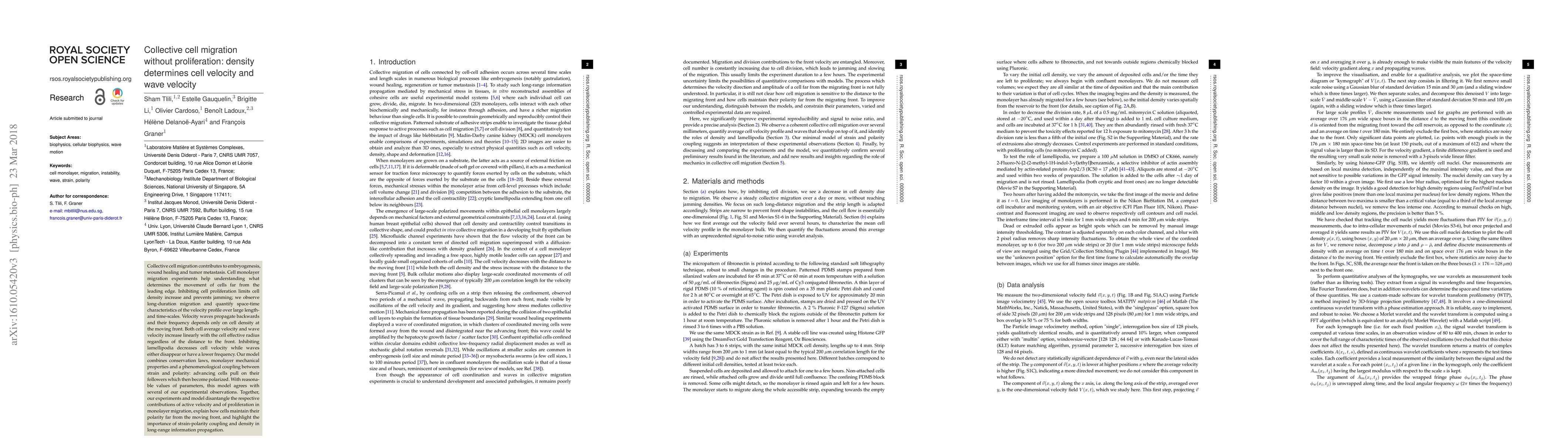 This paper investigates collective cell migration without proliferation, finding that cell density directly influences both average cell velocity and wave velocity. Experiments show linear increases in these velocities with cell effective radius, while inhibition of lamellipodia affects cell movement but disrupts wave propagation. A proposed model incorporating conservation laws and mechanical properties aligns with observed behaviors, emphasizing the role of density and strain-polarity coupling in migration dynamics.