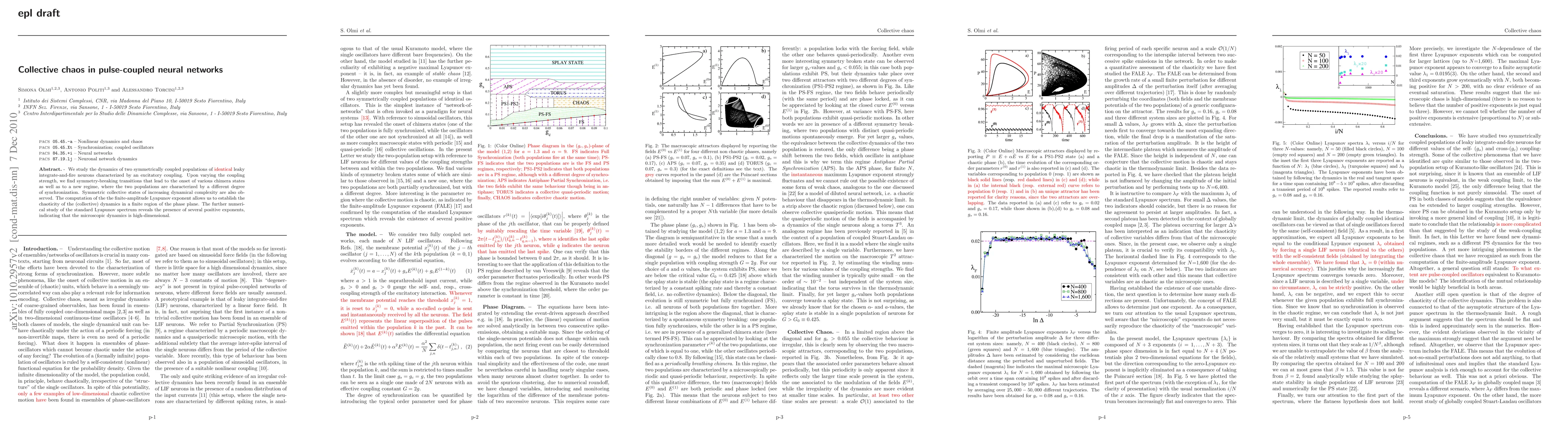 We study the dynamics of two symmetrically coupled populations of identical leaky integrate-and-fire neurons characterized by an excitatory coupling. Upon varying the coupling strength, we find symmetry-breaking transitions that lead to the onset of various chimera states as well as to a new regime, where the two populations are characterized by a different degree of synchronization. Symmetric collective states of increasing dynamical complexity are also observed. The computation of the the finite-amplitude Lyapunov exponent allows us to establish the chaoticity of the (collective) dynamics in a finite region of the phase plane. The further numerical study of the standard Lyapunov spectrum reveals the presence of several positive exponents, indicating that the microscopic dynamics is high-dimensional.