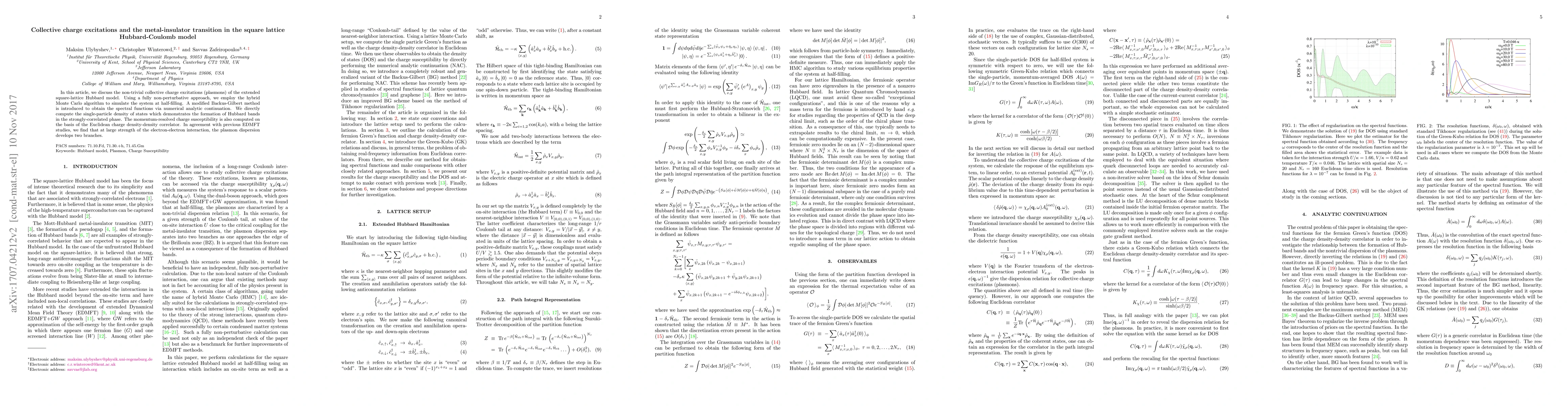 This paper investigates collective charge excitations (plasmons) in the square-lattice Hubbard model using a non-perturbative approach and hybrid Monte Carlo simulations. It finds that the plasmon dispersion splits into two branches at strong electron-electron interactions, consistent with the metal-insulator transition.
