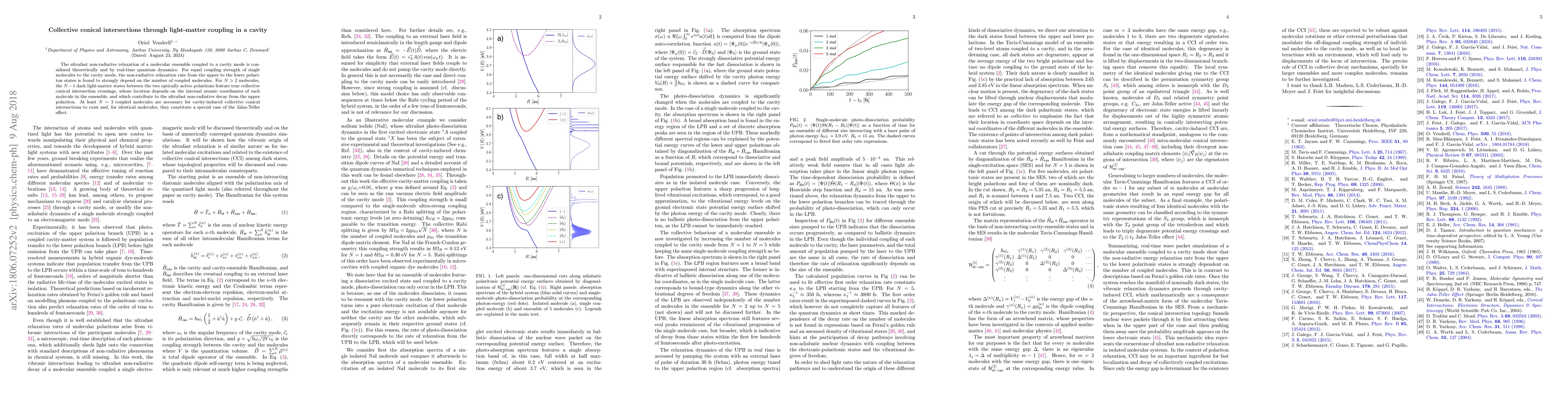 This research investigates the ultrafast relaxation of a molecular ensemble in a cavity, finding that for three or more coupled molecules, collective conical intersections emerge, significantly affecting the non-radiative decay rate and linking this phenomenon to a special case of the Jahn-Teller effect.