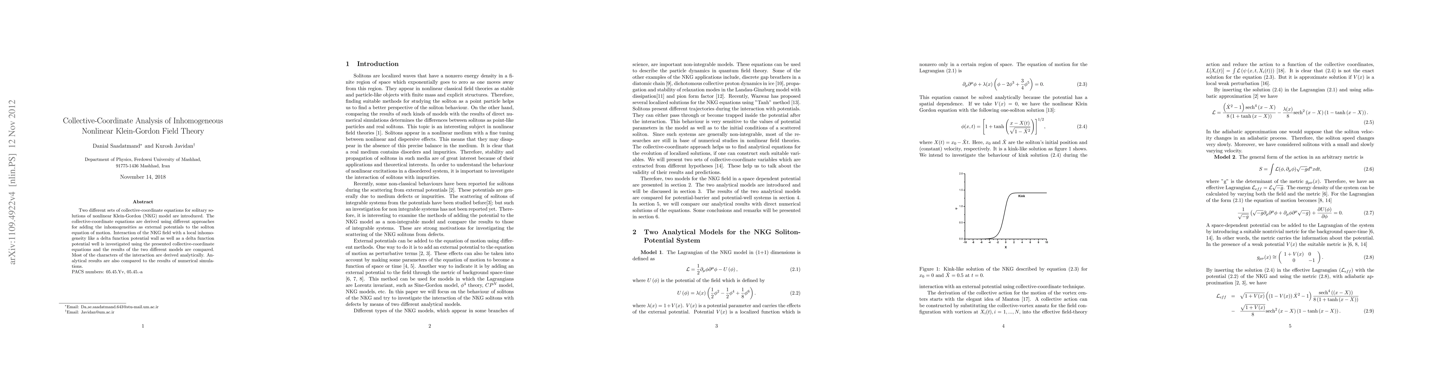 The research introduces two sets of collective-coordinate equations for solitary solutions of the Nonlinear Klein-Gordon (NKG) model, derived using different approaches for adding inhomogeneities as external potentials to the soliton equation of motion.