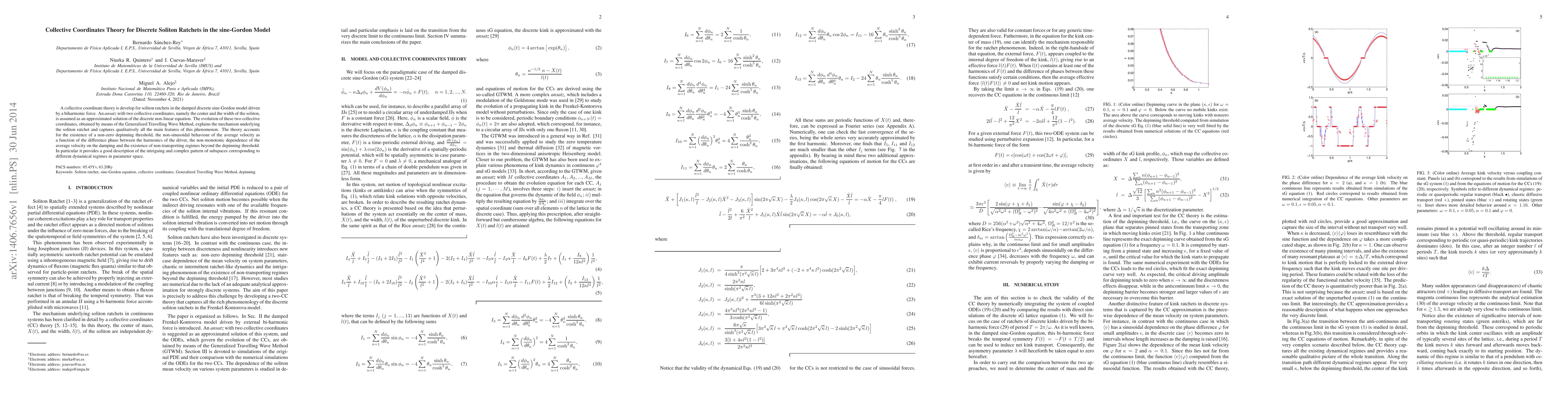 This paper develops a collective coordinate theory for soliton ratchets in the damped discrete sine-Gordon model, using an ansatz for the soliton's center and width. The theory explains the soliton ratchet mechanism, capturing features such as non-zero depinning thresholds and complex dynamical regimes.