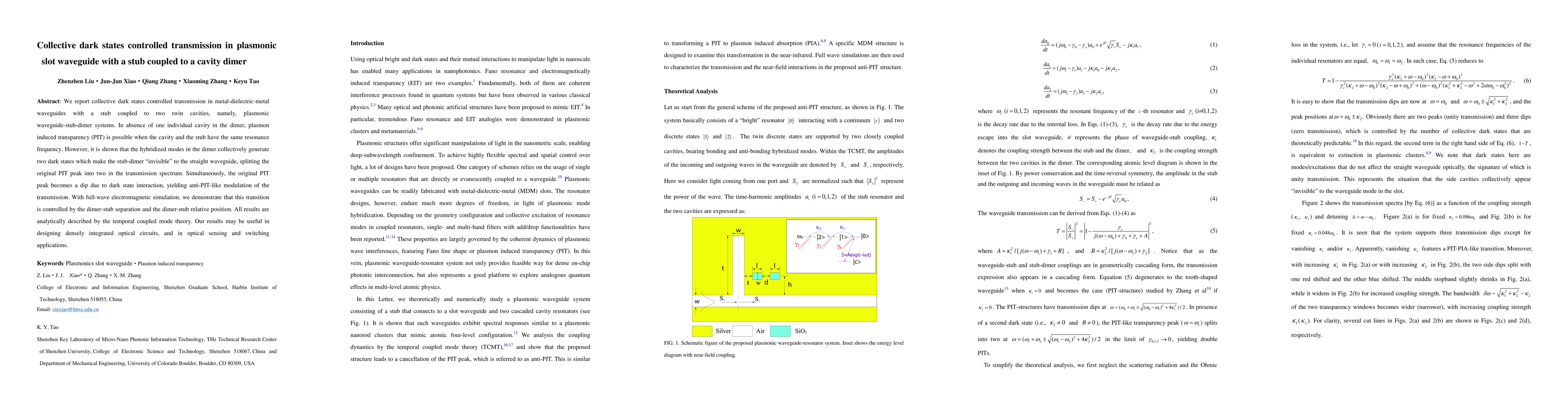 This paper investigates collective dark states in plasmonic slot waveguides with a stub coupled to a cavity dimer, demonstrating controlled transmission modulation via plasmon-induced transparency. The study reveals that hybridized modes create two dark states, resulting in an anti-PIT-like dip in the transmission spectrum, which can be tuned by adjusting the dimer-stub separation and position.