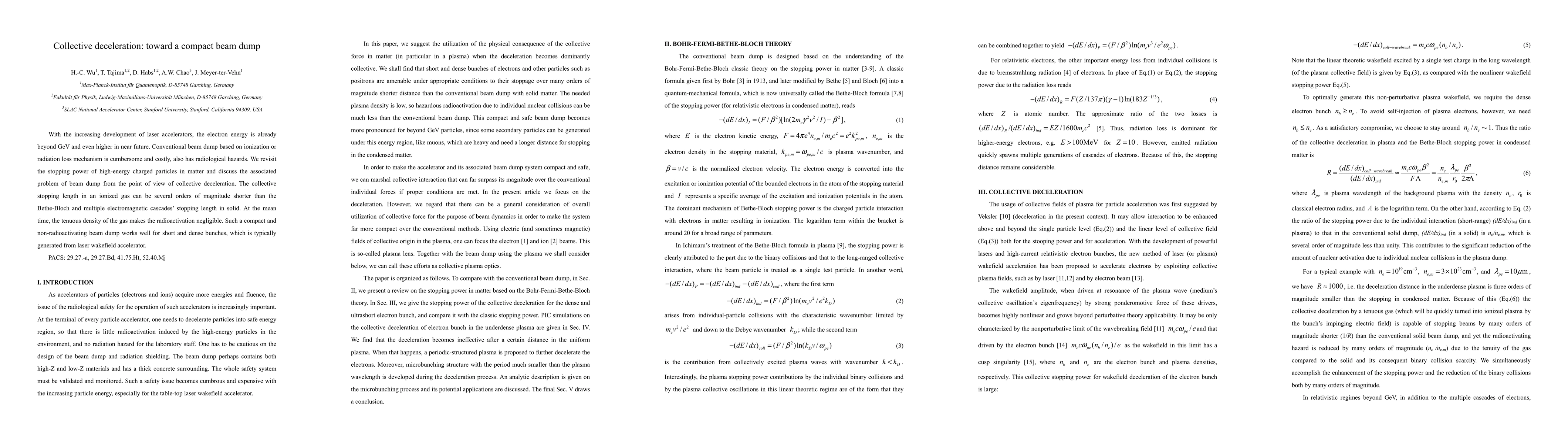 With the increasing development of laser accelerators, the electron energy is already beyond GeV and even higher in near future. Conventional beam dump based on ionization or radiation loss mechanism is cumbersome and costly, also has radiological hazards. We revisit the stopping power of high-energy charged particles in matter and discuss the associated problem of beam dump from the point of view of collective deceleration. The collective stopping length in an ionized gas can be several orders of magnitude shorter than the Bethe-Bloch and multiple electromagnetic cascades' stopping length in solid. At the mean time, the tenuous density of the gas makes the radioactivation negligible. Such a compact and non-radioactivating beam dump works well for short and dense bunches, which is typically generated from laser wakefield accelerator.