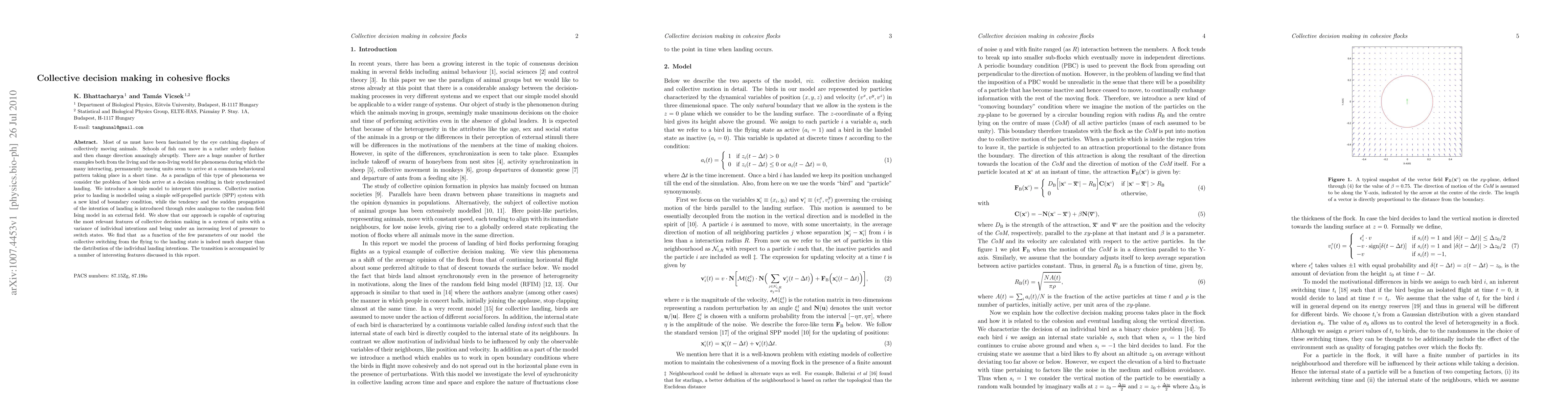Most of us must have been fascinated by the eye catching displays of collectively moving animals. Schools of fish can move in a rather orderly fashion and then change direction amazingly abruptly. There are a huge number of further examples both from the living and the non-living world for phenomena during which the many interacting, permanently moving units seem to arrive at a common behavioural pattern taking place in a short time. As a paradigm of this type of phenomena we consider the problem of how birds arrive at a decision resulting in their synchronized landing. We introduce a simple model to interpret this process. Collective motion prior to landing is modelled using a simple self-propelled particle (SPP) system with a new kind of boundary condition, while the tendency and the sudden propagation of the intention of landing is introduced through rules analogous to the random field Ising model in an external field. We show that our approach is capable of capturing the most relevant features of collective decision making in a system of units with a variance of individual intentions and being under an increasing level of pressure to switch states. We find that as a function of the few parameters of our model the collective switching from the flying to the landing state is indeed much sharper than the distribution of the individual landing intentions. The transition is accompanied by a number of interesting features discussed in this report.