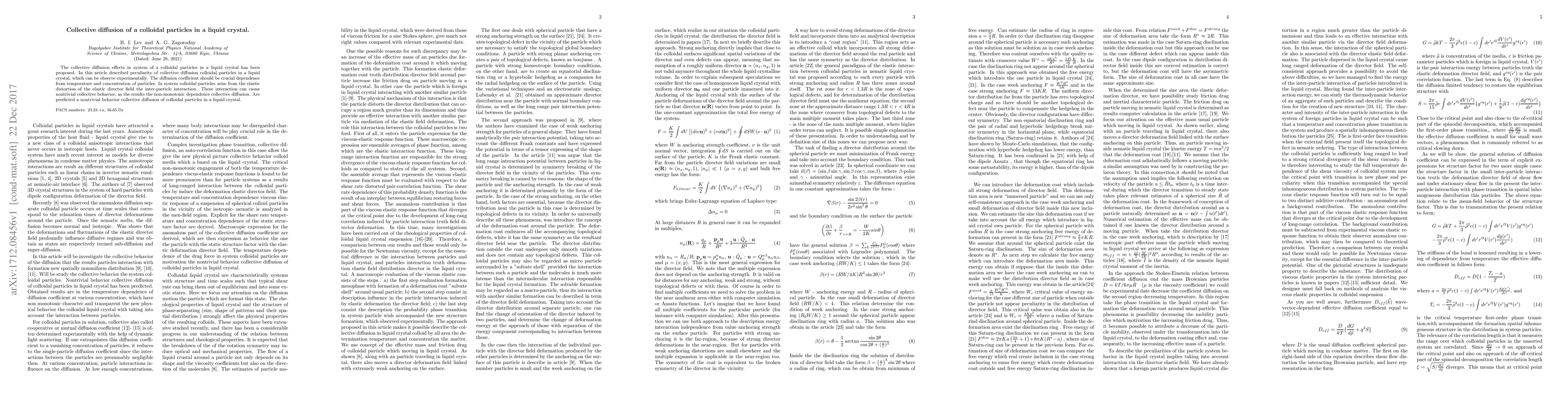 This paper investigates the collective diffusion behavior of colloidal particles within a liquid crystal, highlighting its dependence on temperature and particle concentration. The study predicts non-monotonic collective diffusion due to inter-particle interactions arising from elastic distortions in the liquid crystal's director field.