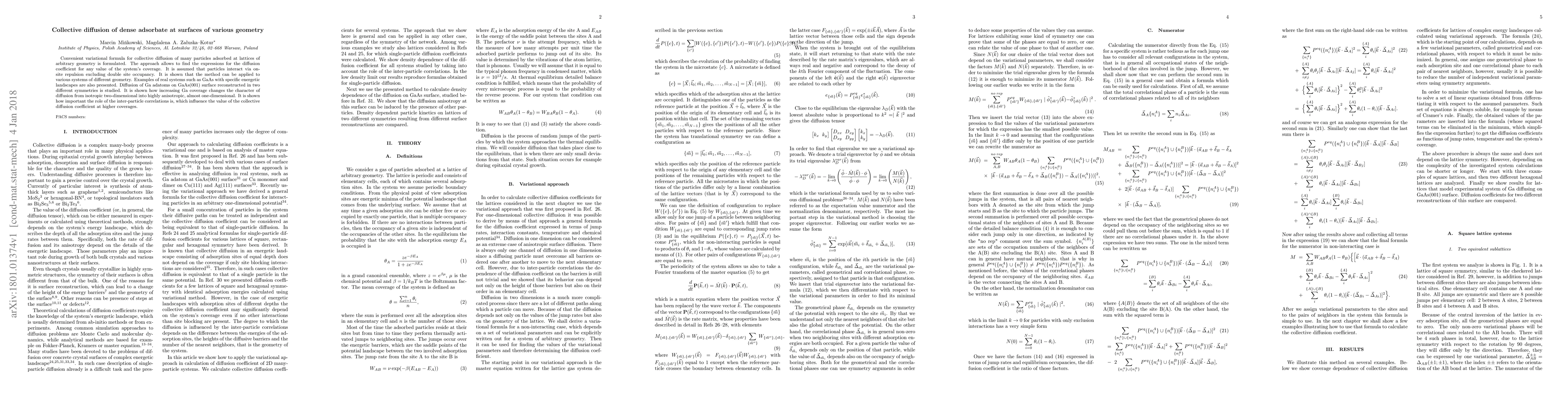 Convenient variational formula for collective diffusion of many particles adsorbed at lattices of arbitrary geometry is formulated. The approach allows to find the expressions for the diffusion coefficient for any value of the system's coverage. It is assumed that particles interact via on-site repulsion excluding double site occupancy. It is shown that the method can be applied to various systems of different geometry. Examples of real systems such as GaAs with specific energetic landscapes are also presented. Diffusion of Ga adatoms on GaAs(001) surface reconstructed in two different symmetries is studied. It is shown how increasing Ga coverage changes the character of diffusion from isotropic two-dimensional into highly anisotropic, almost one-dimensional. It is shown how important the role of the inter-particle correlations is, which influence the value of the collective diffusion coefficient at higher coverages.