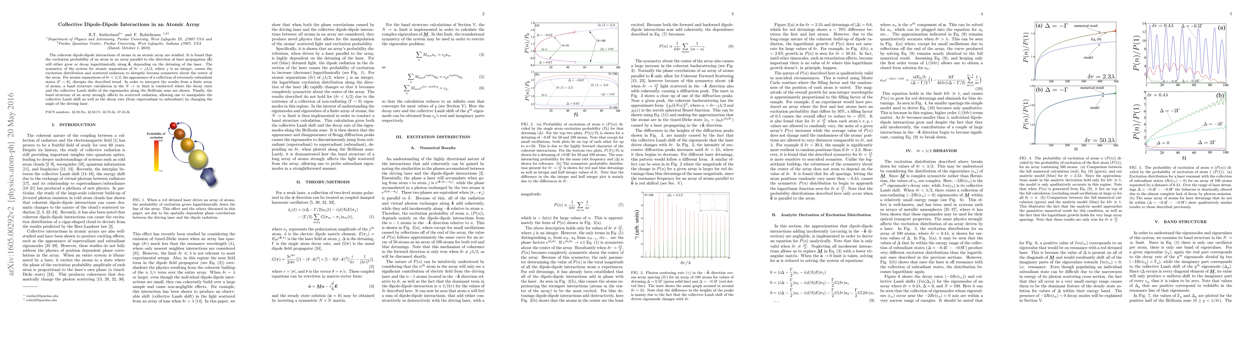 The coherent dipole-dipole interactions of atoms in an atomic array are studied. It is found that the excitation probability of an atom in an array parallel to the direction of laser propagation ($\boldsymbol{\hat{k}}$) will either grow or decay logarithmically along $\boldsymbol{\hat{k}}$, depending on the detuning of the laser. The symmetry of the system for atomic separations of $\delta r = j\lambda/2$, where $j$ is an integer, causes the excitation distribution and scattered radiation to abruptly become symmetric about the center of the array. For atomic separations of $\delta r < \lambda/2$, the appearance of a collection of extremely subradiant states ($\Gamma\sim 0$), disrupts the described trend. In order to interpret the results from a finite array of atoms, a band structure calculation in the $N\rightarrow \infty$ limit is conducted where the decay rates and the Collective Lamb Shifts of the eigenmodes along the Brillouin zone are shown. Finally, the band structure of an array strongly affects its scattered radiation, allowing one to manipulate the Collective Lamb Shift as well as the decay rate (from superradiant to subradiant) by changing the angle of the driving laser.