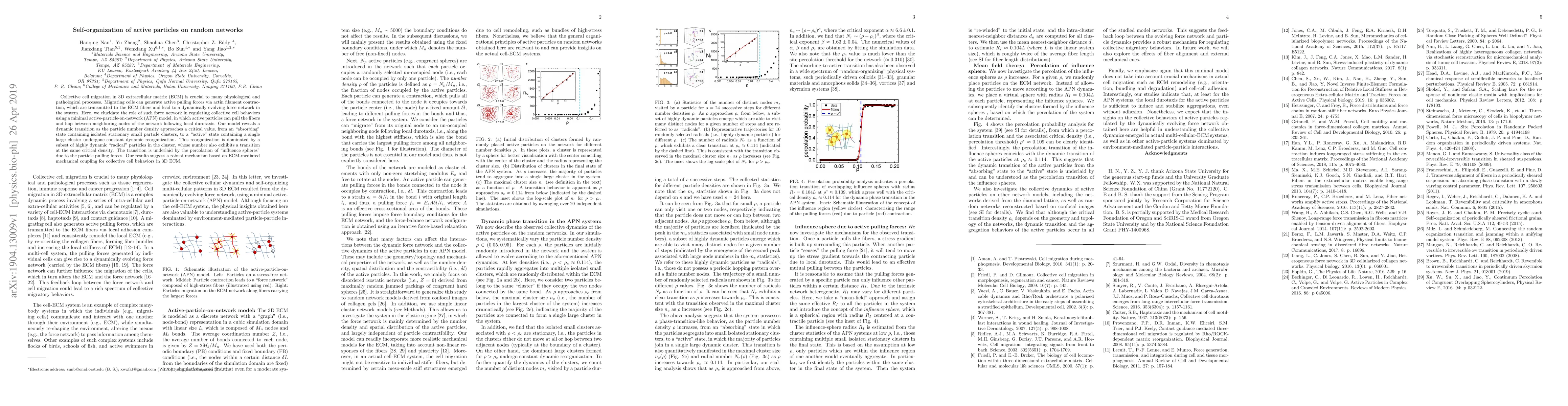 This research introduces an Active-Particle-on-Network (APN) model to understand how cells' pulling forces on extracellular matrix fibers influence collective migration in 3D. The model identifies a critical density where a transition occurs from isolated small clusters to a dynamic, large cluster, driven by 'radical' particles and 'influence spheres'. This suggests a mechanical coupling mechanism for coordinated cell behaviors in 3D environments.