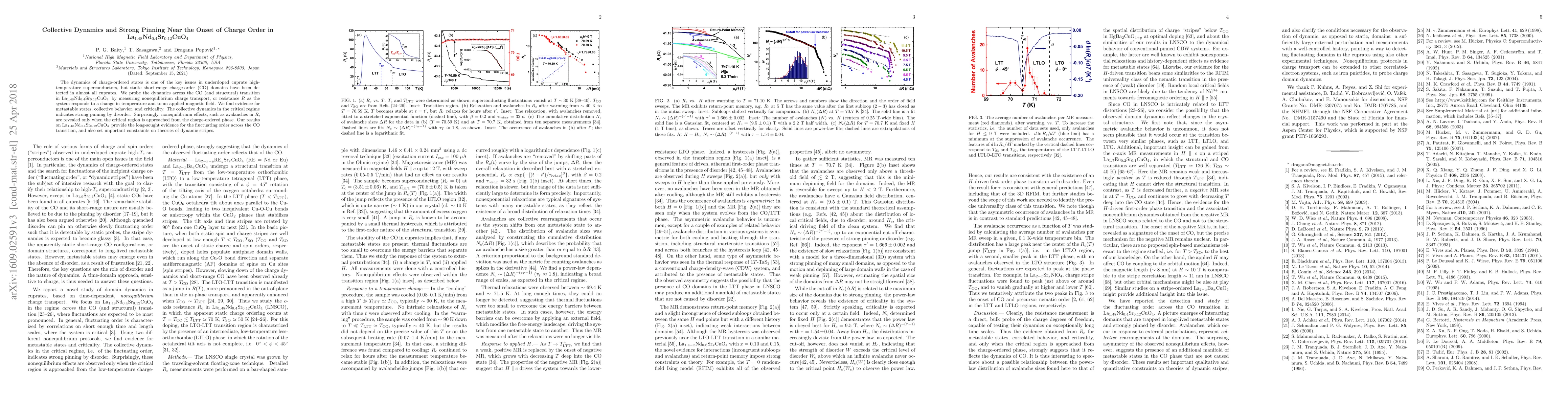 The dynamics of charge-ordered states is one of the key issues in underdoped cuprate high-temperature superconductors, but static short-range charge-order (CO) domains have been detected in almost all cuprates. We probe the dynamics across the CO (and structural) transition in La$_{1.48}$Nd$_{0.4}$Sr$_{0.12}$CuO$_{4}$ by measuring nonequilibrium charge transport, or resistance $R$ as the system responds to a change in temperature and to an applied magnetic field. We find evidence for metastable states, collective behavior, and criticality. The collective dynamics in the critical regime indicates strong pinning by disorder. Surprisingly, nonequilibrium effects, such as avalanches in $R$, are revealed only when the critical region is approached from the charge-ordered phase. Our results on La$_{1.48}$Nd$_{0.4}$Sr$_{0.12}$CuO$_{4}$ provide the long-sought evidence for the fluctuating order across the CO transition, and also set important constraints on theories of dynamic stripes.