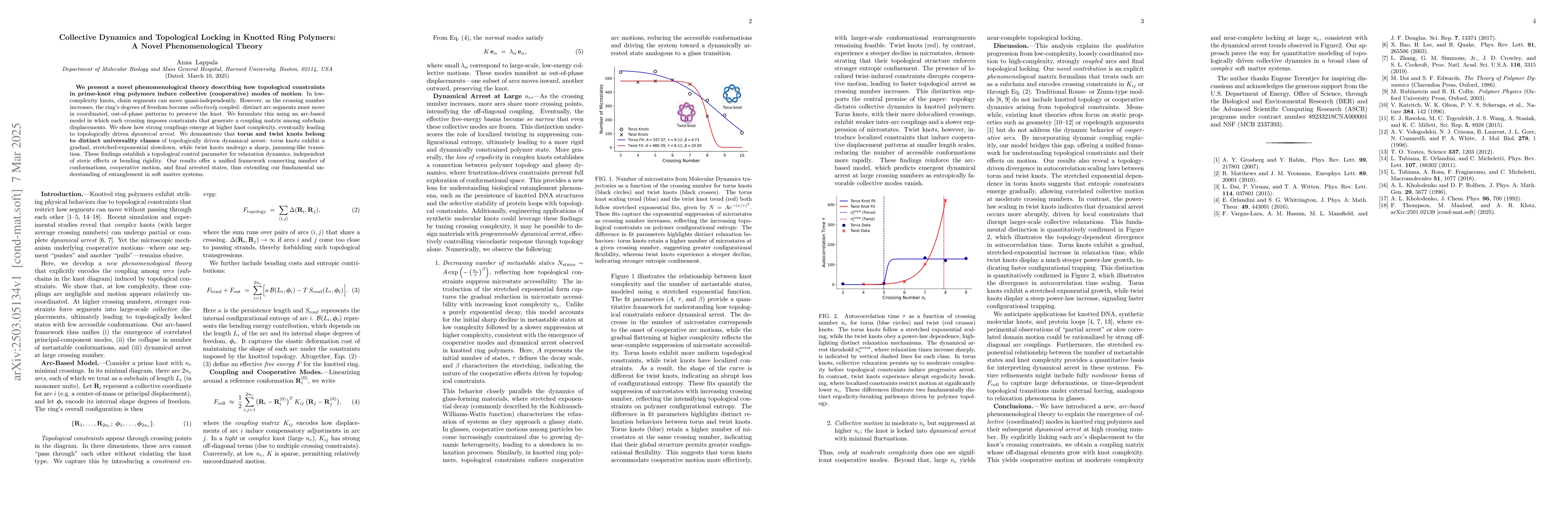 The arc-based model explicitly encodes crossing constraints and demonstrates how they induce cooperative modes of motion in knotted ring polymers, leading to topologically driven dynamical arrest.