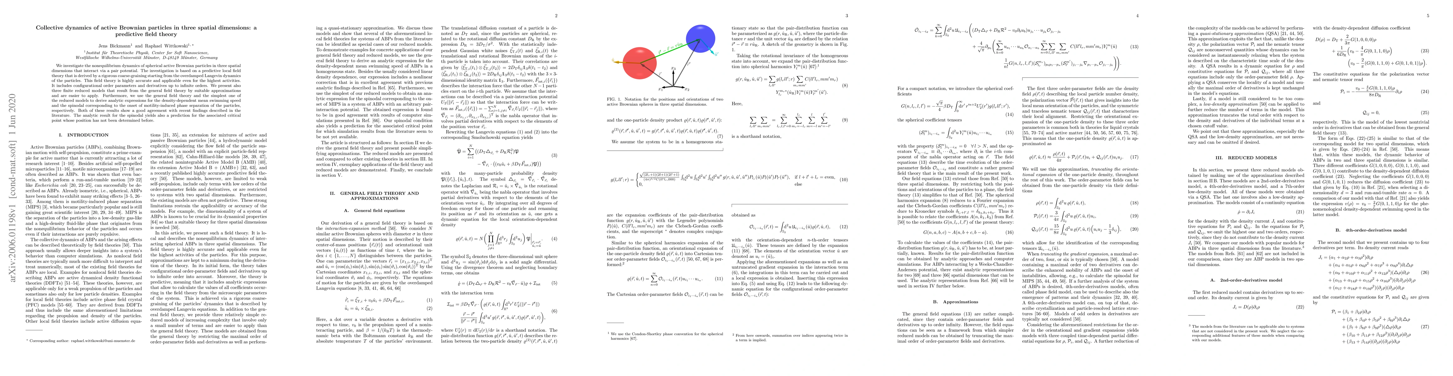 We investigate the nonequilibrium dynamics of spherical active Brownian particles in three spatial dimensions that interact via a pair potential. The investigation is based on a predictive local field theory that is derived by a rigorous coarse-graining starting from the overdamped Langevin dynamics of the particles. This field theory is highly accurate and applicable even for the highest activities. It includes configurational order parameters and derivatives up to infinite orders. We present also three finite reduced models that result from the general field theory by suitable approximations and are easier to apply. Furthermore, we use the general field theory and the simplest one of the reduced models to derive analytic expressions for the density-dependent mean swimming speed and the spinodal corresponding to the onset of motility-induced phase separation of the particles, respectively. Both of these results show a good agreement with recent findings described in the literature. The analytic result for the spinodal yields also a prediction for the associated critical point whose position has not been determined before.