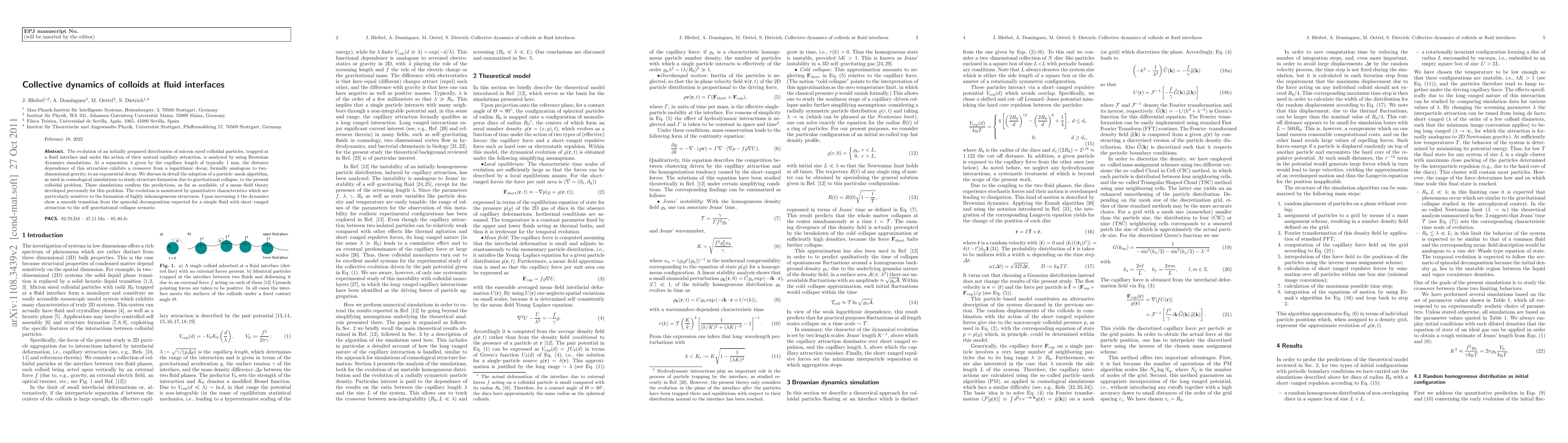 The evolution of an initially prepared distribution of micron sized colloidal particles, trapped at a fluid interface and under the action of their mutual capillary attraction, is analyzed by using Brownian dynamics simulations. At a separation \lambda\ given by the capillary length of typically 1 mm, the distance dependence of this attraction exhibits a crossover from a logarithmic decay, formally analogous to two-dimensional gravity, to an exponential decay. We discuss in detail the adaption of a particle-mesh algorithm, as used in cosmological simulations to study structure formation due to gravitational collapse, to the present colloidal problem. These simulations confirm the predictions, as far as available, of a mean-field theory developed previously for this problem. The evolution is monitored by quantitative characteristics which are particularly sensitive to the formation of highly inhomogeneous structures. Upon increasing \lambda\ the dynamics show a smooth transition from the spinodal decomposition expected for a simple fluid with short-ranged attraction to the self-gravitational collapse scenario.