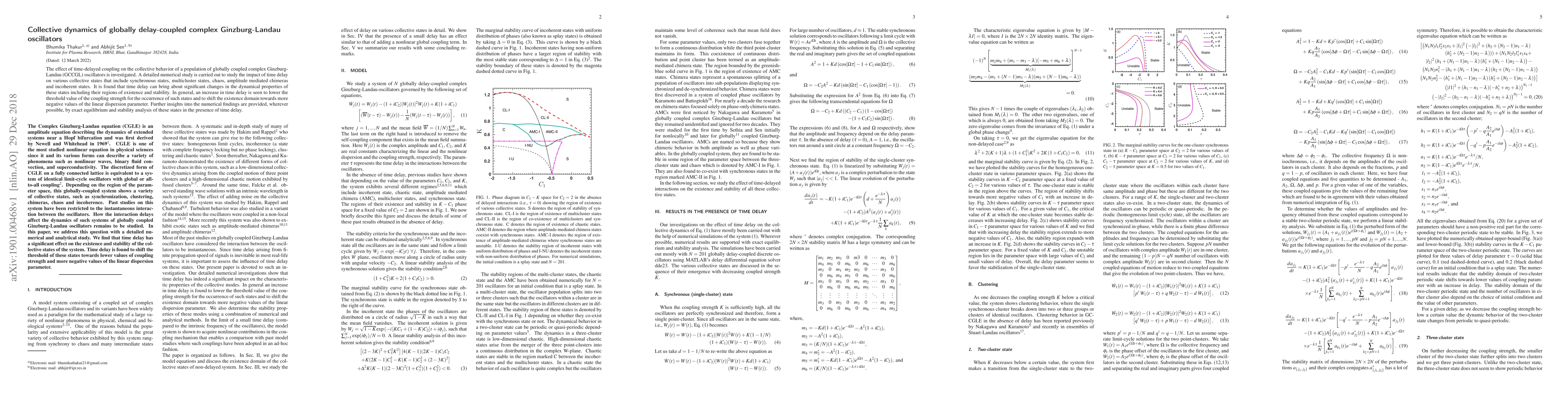 The effect of time-delayed coupling on the collective behavior of a population of globally coupled complex Ginzburg-Landau (GCCGL) oscillators is investigated. A detailed numerical study is carried out to study the impact of time delay on various collective states that include synchronous states, multicluster states, chaos, amplitude mediated chimeras and incoherent states. It is found that time delay can bring about significant changes in the dynamical properties of these states including their regions of existence and stability. In general, an increase in time delay is seen to lower the threshold value of the coupling strength for the occurrence of such states and to shift the existence domain towards more negative values of the linear dispersion parameter. Further insights into the numerical findings are provided, wherever possible, by exact equilibrium and stability analysis of these states in the presence of time delay.