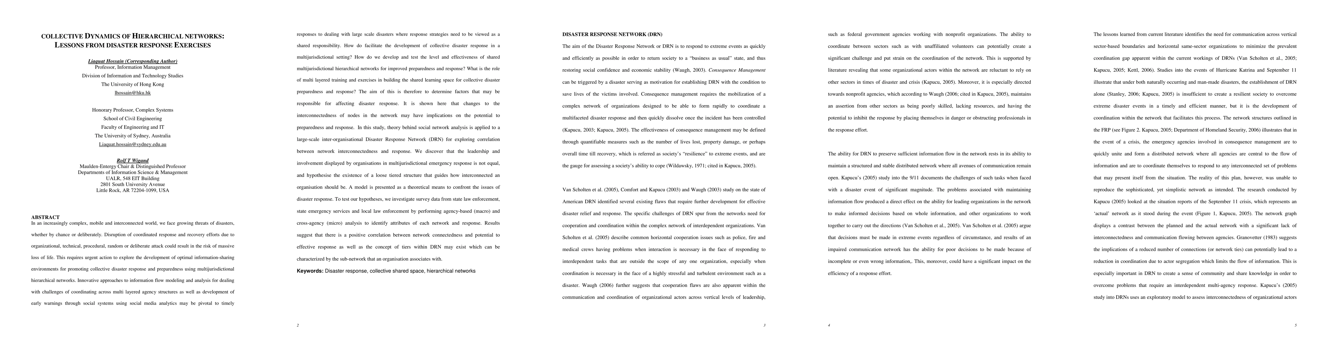 In an increasingly complex, mobile and interconnected world, we face growing threats of disasters, whether by chance or deliberately. Disruption of coordinated response and recovery efforts due to organizational, technical, procedural, random or deliberate attack could result in the risk of massive loss of life. This requires urgent action to explore the development of optimal information-sharing environments for promoting collective disaster response and preparedness using multijurisdictional hierarchical networks. Innovative approaches to information flow modeling and analysis for dealing with challenges of coordinating across multi layered agency structures as well as development of early warnings through social systems using social media analytics may be pivotal to timely responses to dealing with large scale disasters where response strategies need to be viewed as a shared responsibility. How do facilitate the development of collective disaster response in a multijurisdictional setting? How do we develop and test the level and effectiveness of shared multijurisdictional hierarchical networks for improved preparedness and response? What is the role of multi layered training and exercises in building the shared learning space for collective disaster preparedness and response? The aim of this is therefore to determine factors that may be responsible for affecting disaster response.