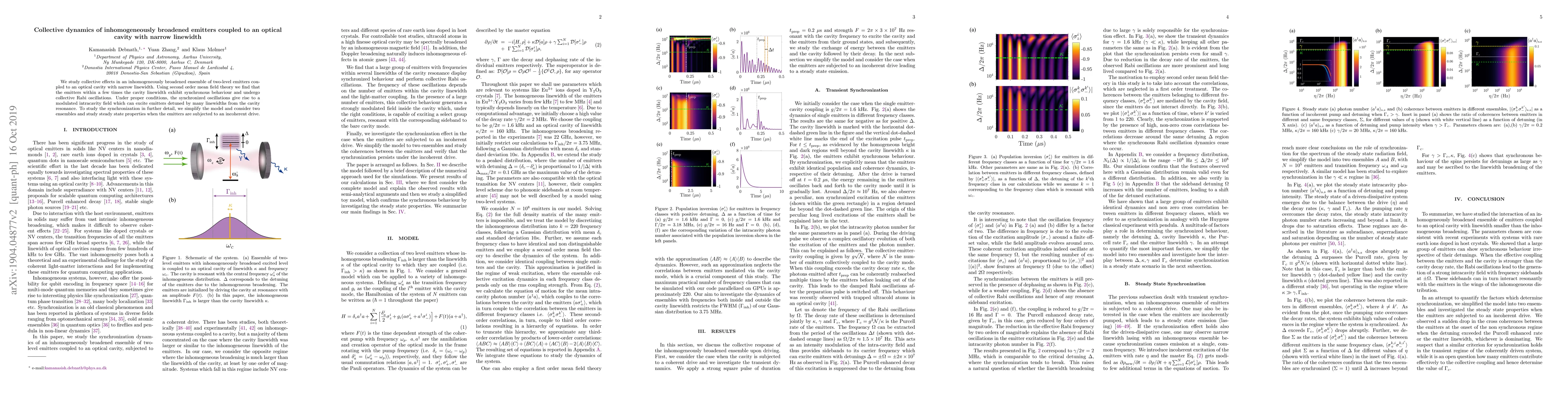This paper investigates collective dynamics in an ensemble of inhomogeneously broadened emitters coupled to a narrow linewidth optical cavity, revealing synchronous behavior and collective Rabi oscillations within a few cavity linewidths. It further explores how synchronized oscillations can excite detuned emitters and examines steady-state properties under incoherent drive.
