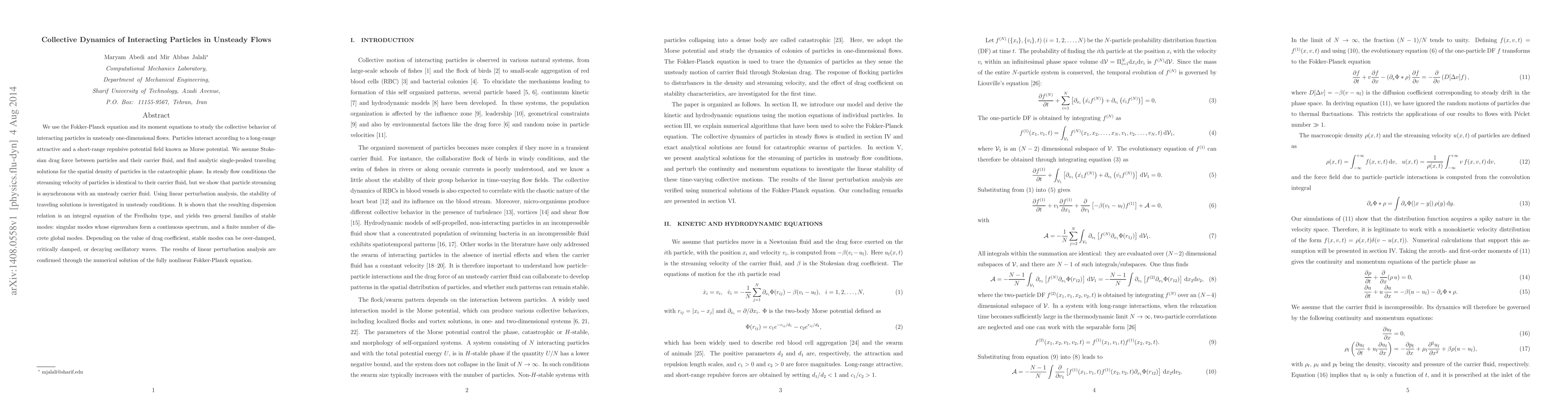 We use the Fokker-Planck equation and its moment equations to study the collective behavior of interacting particles in unsteady one-dimensional flows. Particles interact according to a long-range attractive and a short-range repulsive potential field known as Morse potential. We assume Stokesian drag force between particles and their carrier fluid, and find analytic single-peaked traveling solutions for the spatial density of particles in the catastrophic phase. In steady flow conditions the streaming velocity of particles is identical to their carrier fluid, but we show that particle streaming is asynchronous with an unsteady carrier fluid. Using linear perturbation analysis, the stability of traveling solutions is investigated in unsteady conditions. It is shown that the resulting dispersion relation is an integral equation of the Fredholm type, and yields two general families of stable modes: singular modes whose eigenvalues form a continuous spectrum, and a finite number of discrete global modes. Depending on the value of drag coefficient, stable modes can be over-damped, critically damped, or decaying oscillatory waves. The results of linear perturbation analysis are confirmed through the numerical solution of the fully nonlinear Fokker-Planck equation.