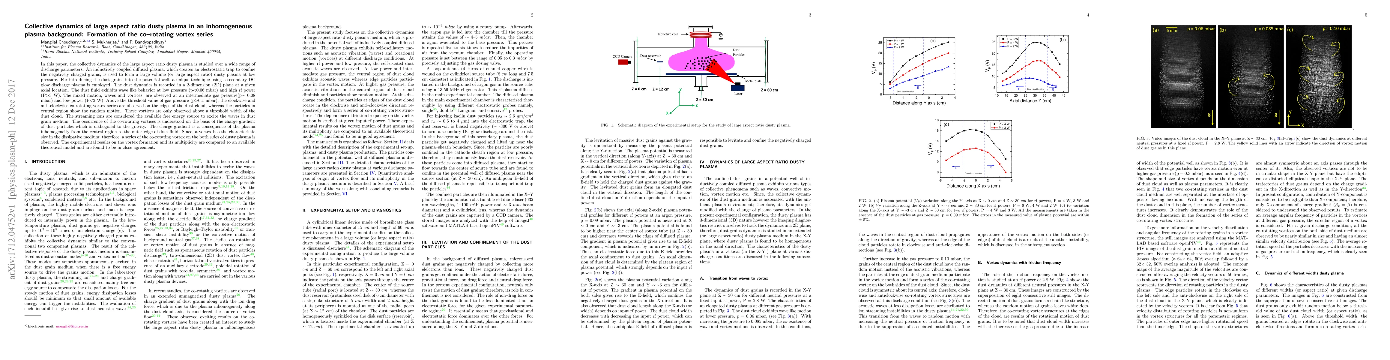 In this paper, the collective dynamics of the large aspect ratio dusty plasma is studied over a wide range of discharge parameters. An inductively coupled diffused plasma, which creates an electrostatic trap to confine the negatively charged grains, is used to form a large volume (or large aspect ratio) dusty plasma at low pressure. For introducing the dust grains into the potential well, a unique technique using a secondary DC glow discharge plasma is employed. The dust dynamics is recorded in a 2-dimension (2D) plane at a given axial location. The dust fluid exhibits wave like behavior at low pressure (p < 0.06 mbar) and high rf power (P > 3 W). The mixed motion, waves and vortices, are observed at an intermediate gas pressure(p = 0.08 mbar) and low power (P < 3 W). Above the threshold value of gas pressure (p > 0.1 mbar), the clockwise and anti-clockwise co-rotating vortex series are observed on the edges of the dust cloud, whereas the particles in central region show the random motion. These vortices are only observed above a threshold width of the dust cloud. The streaming ions are considered the available free energy source to excite the waves in dust grain medium. The occurrence of the co-rotating vortices is understood on the basis of the charge gradient of dust particles which is orthogonal to the gravity. The charge gradient is a consequence of the plasma inhomogeneity from the central region to the outer edge of dust fluid. Since, a vortex has the characteristic size in the dissipative medium; therefore, a series of the co-rotating vortex on the both sides of dusty plasma is observed. The experimental results on the vortex formation and its multiplicity are compared to an available theoretical model and are found to be in close agreement.