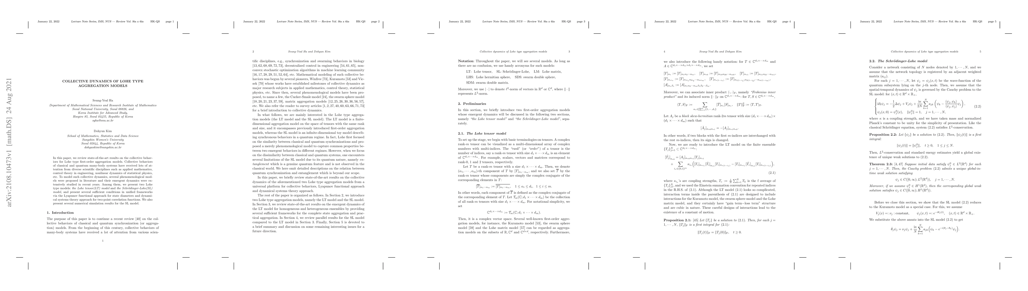 In this paper, we review state-of-the-art results on the collective behaviors for Lohe type first-order aggregation models. Collective behaviors of classical and quantum many-body systems have received lots of attention from diverse scientific disciplines such as applied mathematics, control theory in engineering, nonlinear dynamics of statistical physics, etc. To model such collective dynamics, several phenomenological models were proposed in literature and their emergent dynamics were extensively studied in recent years. Among them, we present two Lohe type models: the Lohe tensor (LT) model and the Schrodinger-Lohe mode}, and present several sufficient conditions in unified frameworks via the Lyapunov functional approach for state diameters and dynamical systems theory approach for two-point correlation functions. We also present several numerical simulation results for the SL model.