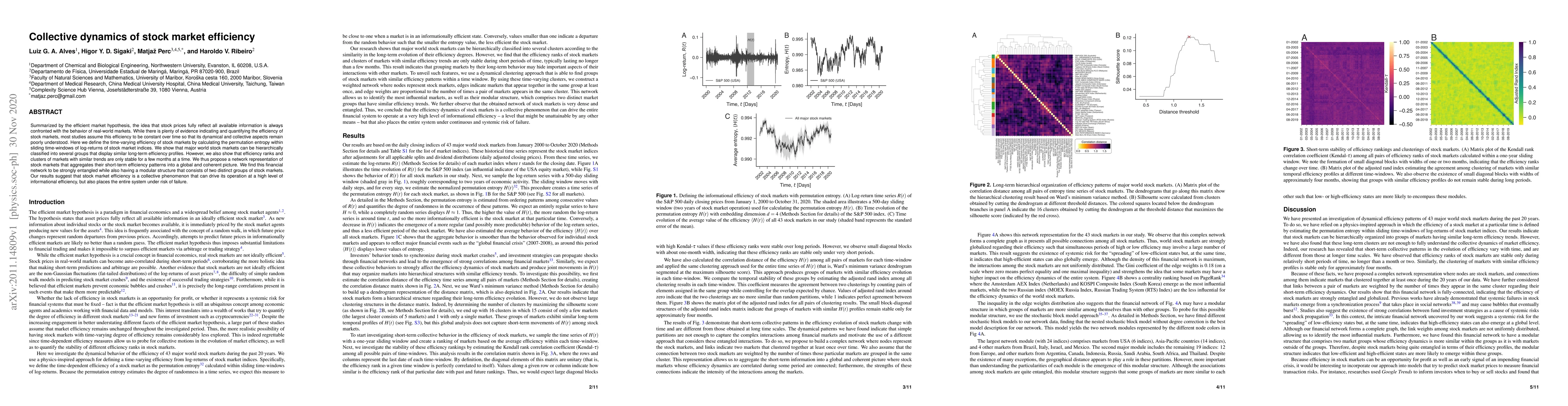 This paper investigates the dynamic and collective aspects of stock market efficiency using permutation entropy within sliding time-windows of log-returns. It reveals that major world stock markets form transient clusters with similar long-term efficiency profiles, suggesting that market efficiency is a collective, yet unstable phenomenon, leading to a modular financial network with inherent systemic risk.