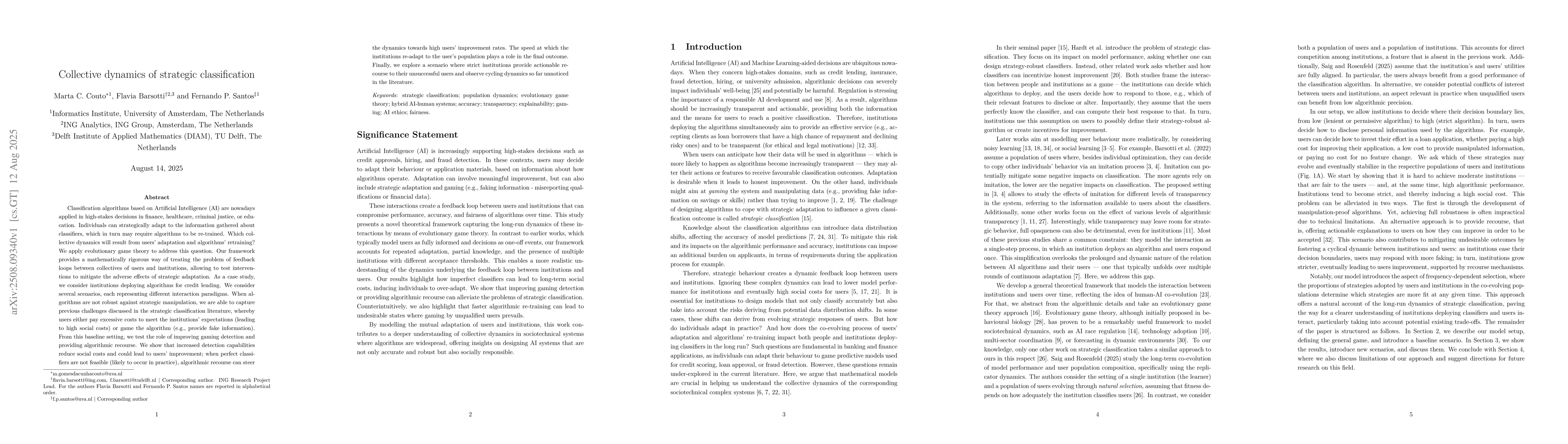 Classification algorithms based on Artificial Intelligence (AI) are nowadays applied in high-stakes decisions in finance, healthcare, criminal justice, or education. Individuals can strategically adapt to the information gathered about classifiers, which in turn may require algorithms to be re-trained. Which collective dynamics will result from users' adaptation and algorithms' retraining? We apply evolutionary game theory to address this question. Our framework provides a mathematically rigorous way of treating the problem of feedback loops between collectives of users and institutions, allowing to test interventions to mitigate the adverse effects of strategic adaptation. As a case study, we consider institutions deploying algorithms for credit lending. We consider several scenarios, each representing different interaction paradigms. When algorithms are not robust against strategic manipulation, we are able to capture previous challenges discussed in the strategic classification literature, whereby users either pay excessive costs to meet the institutions' expectations (leading to high social costs) or game the algorithm (e.g., provide fake information). From this baseline setting, we test the role of improving gaming detection and providing algorithmic recourse. We show that increased detection capabilities reduce social costs and could lead to users' improvement; when perfect classifiers are not feasible (likely to occur in practice), algorithmic recourse can steer the dynamics towards high users' improvement rates. The speed at which the institutions re-adapt to the user's population plays a role in the final outcome. Finally, we explore a scenario where strict institutions provide actionable recourse to their unsuccessful users and observe cycling dynamics so far unnoticed in the literature.