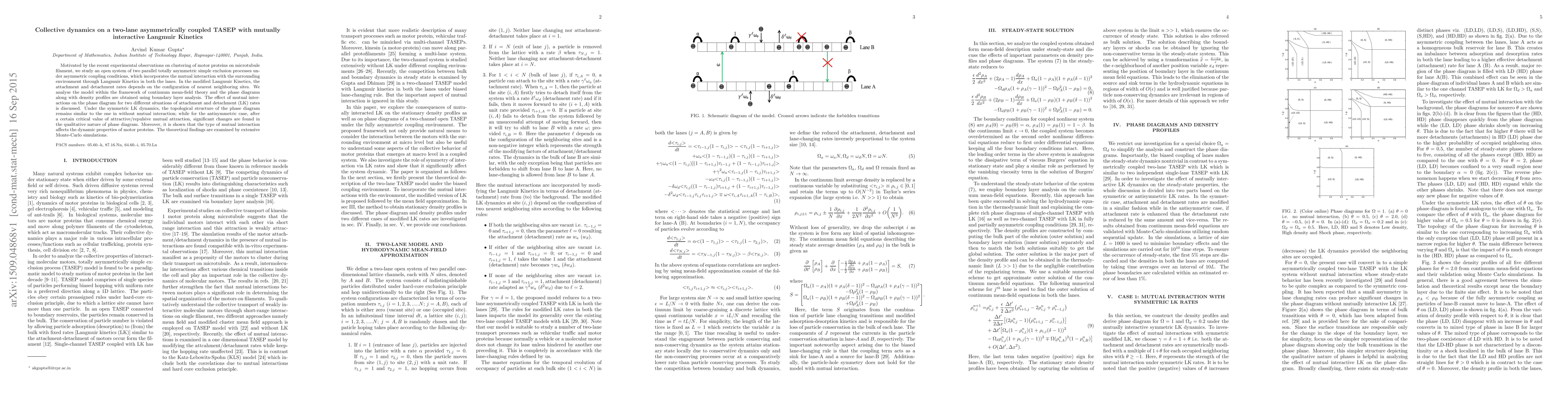 This paper investigates a two-lane totally asymmetric simple exclusion process (TASEP) with asymmetric coupling and Langmuir Kinetics, analyzing how mutual interactions affect phase diagrams and dynamic properties. Theoretical results are validated through Monte-Carlo simulations.