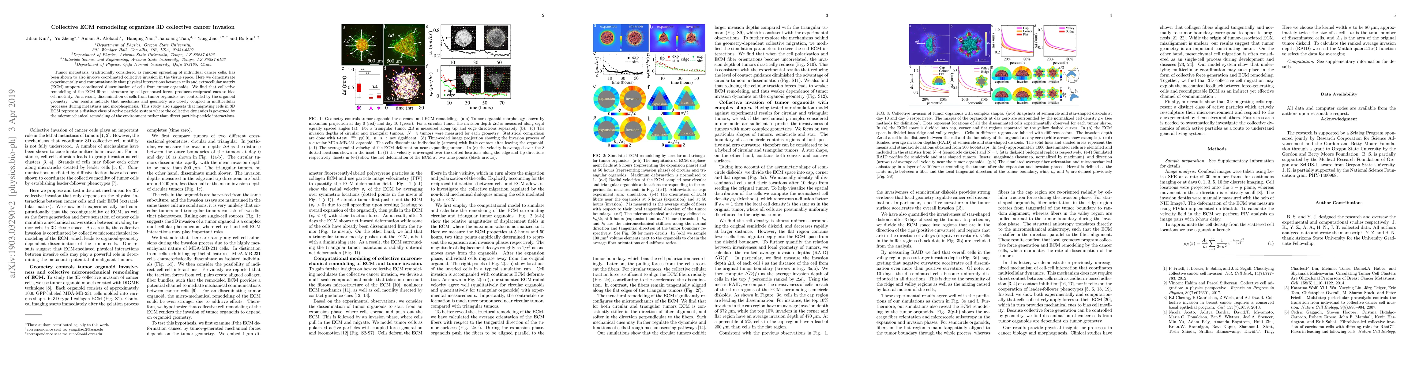 Tumor metastasis, traditionally considered as random spreading of individual cancer cells, has been shown to also involve coordinated collective invasion in the tissue space. Here we demonstrate experimentally and computationally that physical interactions between cells and extracellular matrix (ECM) support coordinated dissemination of cells from tumor organoids. We find that collective remodeling of the ECM fibrous structure by cell-generated forces produces reciprocal cues to bias cell motility. As a result, dissemination of cells from tumor organoids are controlled by the organoid geometry. Our results indicate that mechanics and geometry are closely coupled in multicellular processes during metastasis and morphogenesis. This study also suggests that migrating cells in 3D ECM represent a distinct class of active particle system where the collective dynamics is governed by the micromechanical remodeling of the environment rather than direct particle-particle interactions.