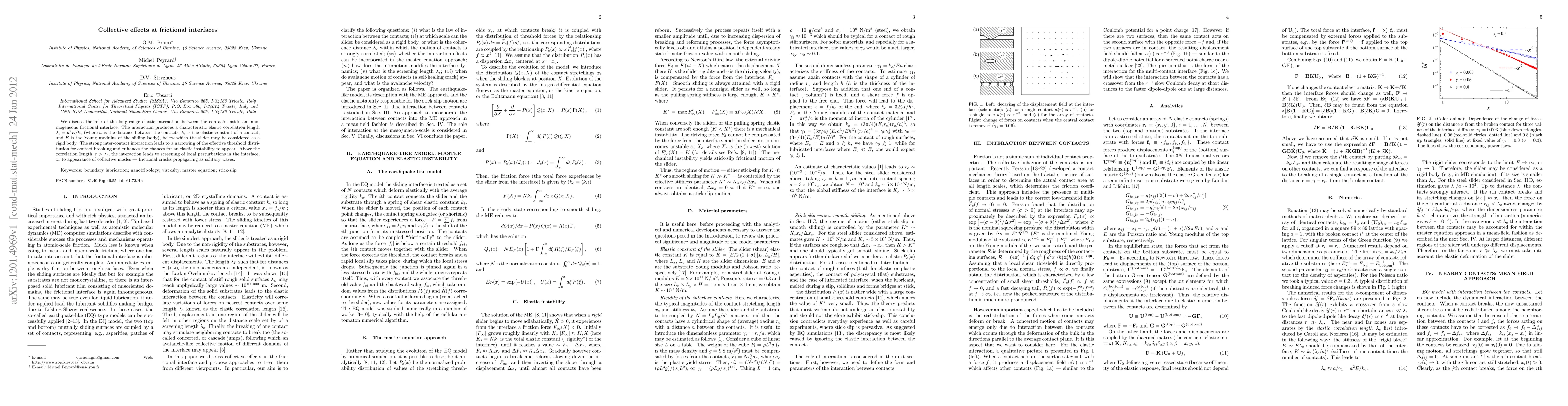 This paper explores the long-range elastic interactions within inhomogeneous frictional interfaces, showing that these interactions create an elastic correlation length that influences the behavior of contacts and can lead to elastic instabilities or collective modes like frictional cracks propagating as solitary waves.