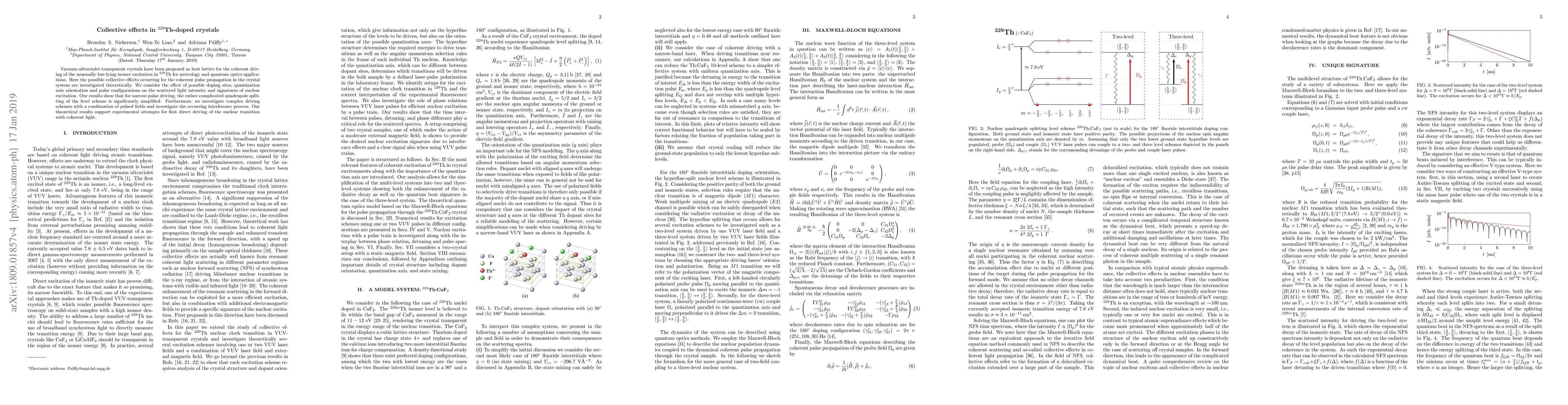 Vacuum-ultraviolet-transparent crystals have been proposed as host lattice for the coherent driving of the unusually low-lying isomer excitation in $^{229}$Th for metrology and quantum optics applications. Here the possible collective effects occurring for the coherent pulse propagation in the crystal system are investigated theoretically. We consider the effect of possible doping sites, quantization axis orientation and pulse configurations on the scattered light intensity and signatures of nuclear excitation. Our results show that for narrow-pulse driving, the rather complicated quadrupole splitting of the level scheme is significantly simplified. Furthermore, we investigate complex driving schemes with a combination of pulsed fields and investigate the occurring interference process. Our theoretical results support experimental attempts for first direct driving of the nuclear transition with coherent light.