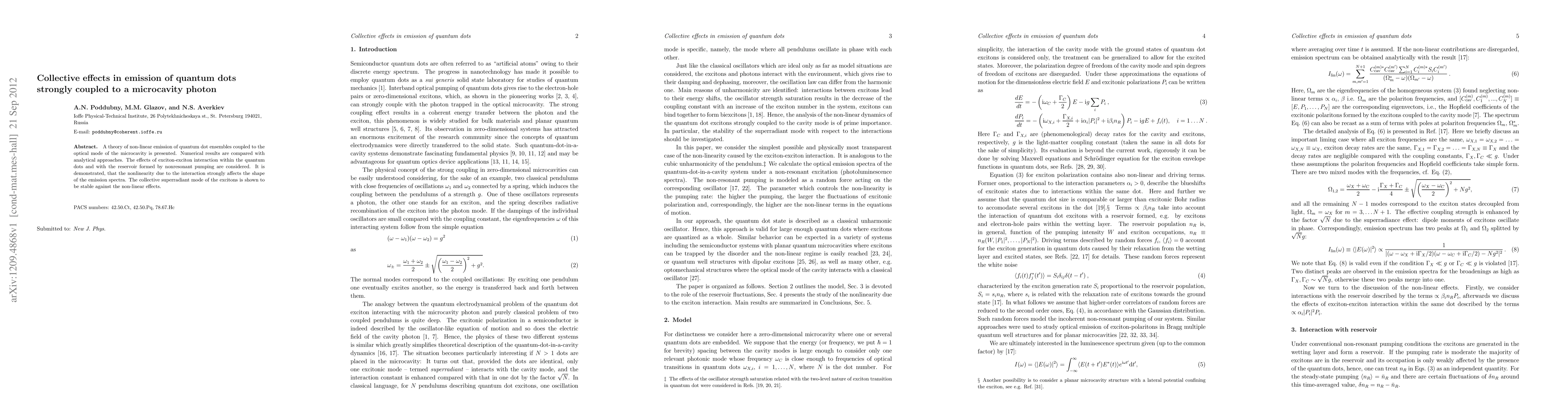 This paper presents a theory of non-linear emission from quantum dot ensembles coupled to microcavity photons, showing how exciton-exciton interactions and nonresonant pumping influence emission spectra. The study reveals that collective superradiant modes remain stable despite non-linear effects.
