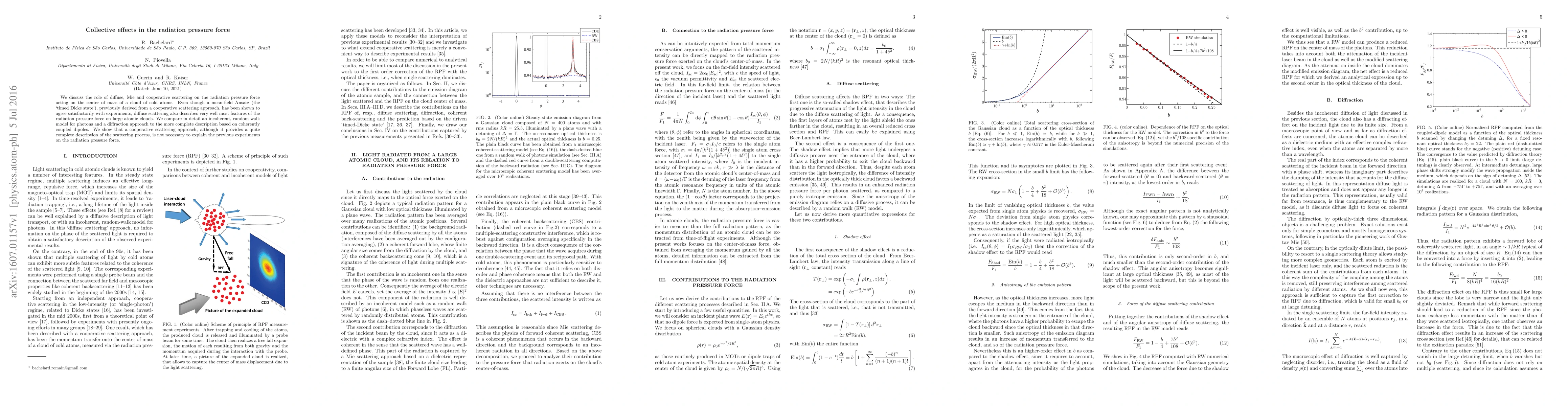 This paper examines the radiation pressure force on a cloud of cold atoms, comparing diffuse, Mie, and cooperative scattering effects. It finds that while a cooperative scattering model fits experimental data well, diffuse scattering provides a similarly effective description, suggesting that a more complete cooperative approach is not essential for explaining observed radiation pressure forces.