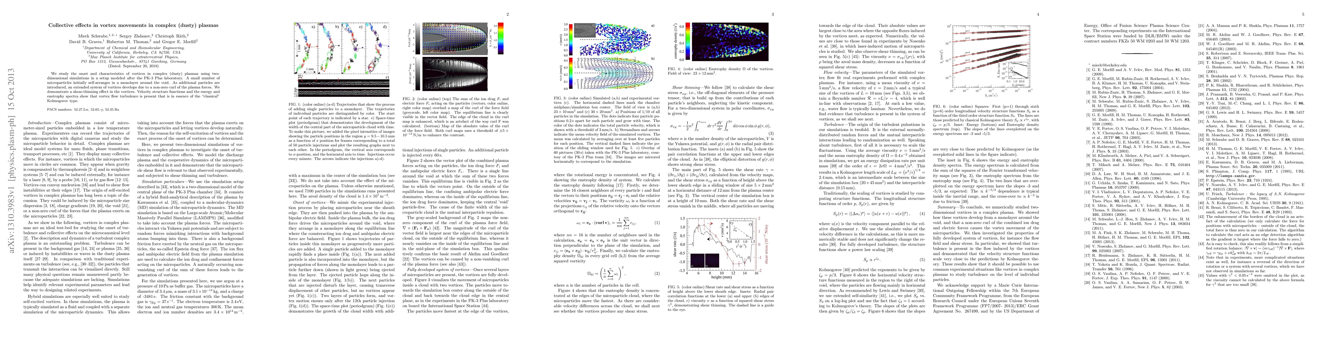 We study the onset and characteristics of vortices in complex (dusty) plasmas using two-dimensional simulations in a setup modeled after the PK-3 Plus laboratory. A small number of microparticles initially self-arranges in a monolayer around the void. As additional particles are introduced, an extended system of vortices develops due to a non-zero curl of the plasma forces. We demonstrate a shear-thinning effect in the vortices. Velocity structure functions and the energy and enstrophy spectra show that vortex flow turbulence is present that is in essence of the "classical" Kolmogorov type.