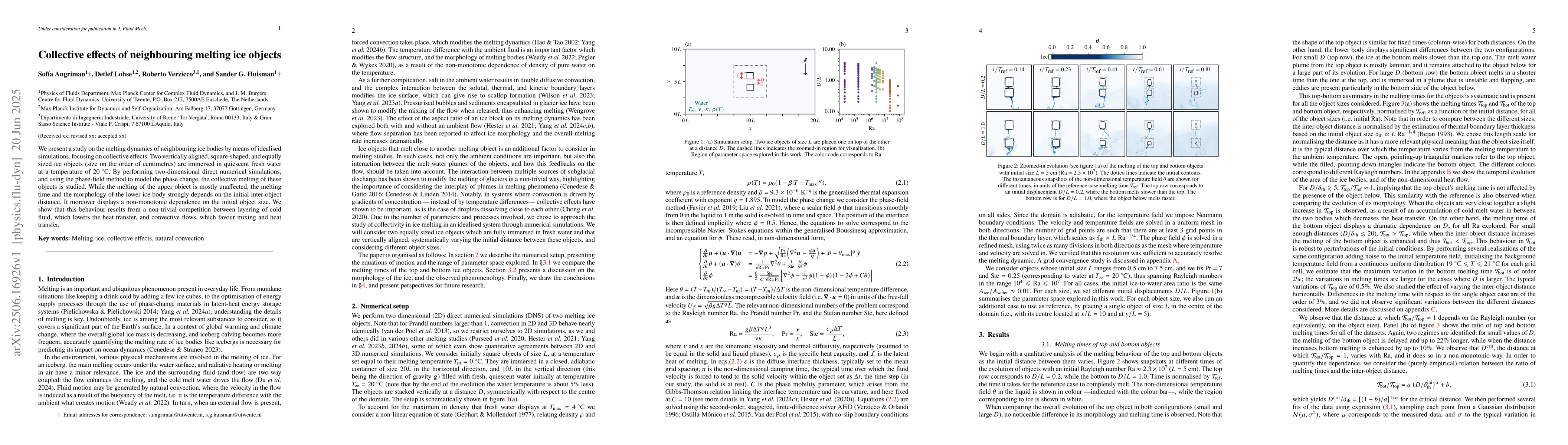 We present a study on the melting dynamics of neighbouring ice bodies by means of idealised simulations, focusing on collective effects. Two vertically aligned, square-shaped, and equally sized ice objects (size on the order of centimetres) are immersed in quiescent fresh water at a temperature of 20 {\deg}C. By performing two-dimensional direct numerical simulations, and using the phase-field method to model the phase change, the collective melting of these objects is studied. While the melting of the upper object is mostly unaffected, the melting time and the morphology of the lower ice body strongly depends on the initial inter-object distance. It moreover displays a non-monotonic dependence on the initial object size. We show that this behaviour results from a non-trivial competition between layering of cold fluid, which lowers the heat transfer, and convective flows, which favour mixing and heat transfer.