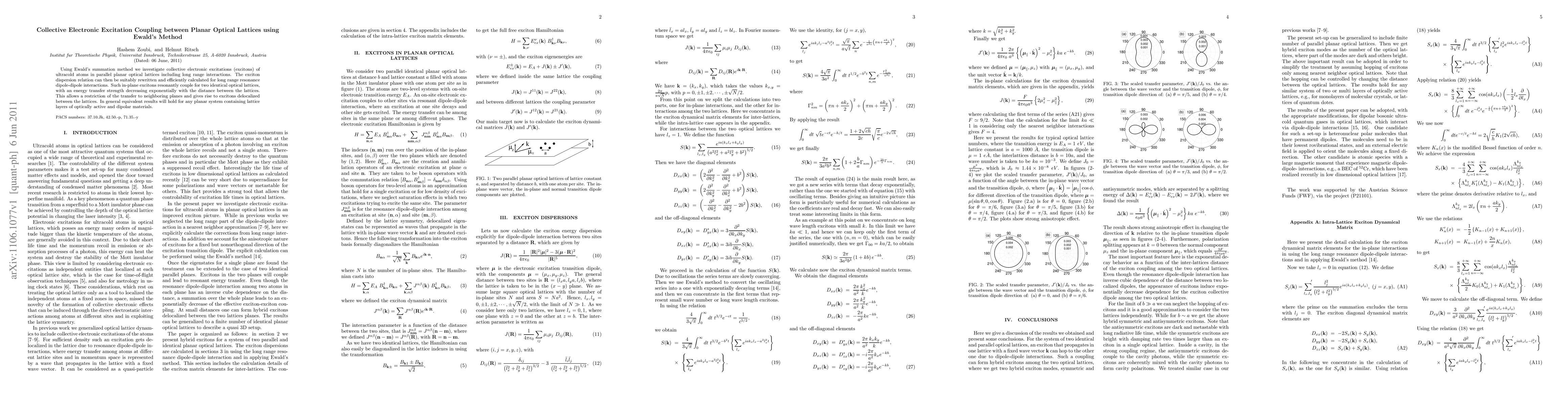Using Ewald's summation method we investigate collective electronic excitations (excitons) of ultracold atoms in parallel planar optical lattices including long range interactions. The exciton dispersion relation can then be suitably rewritten and efficiently calculated for long range resonance dipole-dipole interactions. Such in-plane excitons resonantly couple for two identical optical lattices, with an energy transfer strength decreasing exponentially with the distance between the lattices. This allows a restriction of the transfer to neighboring planes and gives rise to excitons delocalized between the lattices. In general equivalent results will hold for any planar system containing lattice layers of optically active and dipolar materials.