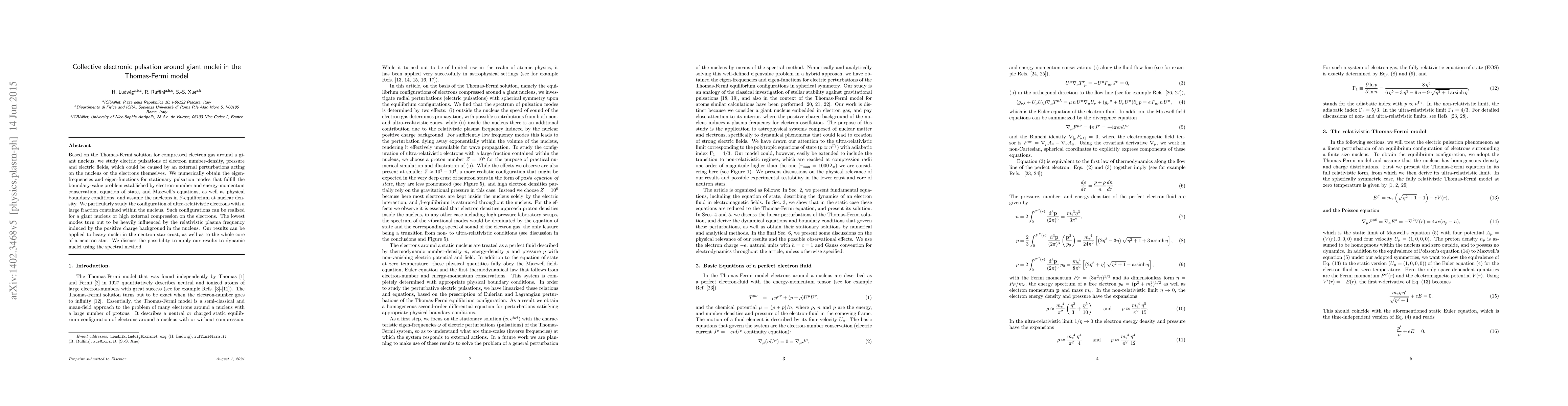 Based on the Thomas-Fermi solution for compressed electron gas around a giant nucleus, $Z\approx 10^6$, we study electric pulsations of electron number-density, pressure and electric fields, which could be caused by an external perturbations acting on the nucleus or the electrons themselves. We numerically obtain the eigen-frequencies and eigen-functions for stationary pulsation modes that fulfill the boundary-value problem established by electron-number and energy-momentum conservation, equation of state, laws of thermodynamics, and Maxwell's equations, as well as physical boundary conditions. We choose a proton number of $Z=10^6$ and assume the nucleons in $\beta$-equilibrium at nuclear density. Similar systems with non-spherical geometry are hypothesized to exist in the lower crust of neutron stars, commonly referred to as \textit{pasta equation of state}. The lowest modes turn out to be heavily influenced by the relativistic plasma frequency induced by the positive charge background in the nucleus. We discuss the possibility to apply our results to dynamic nuclei using the spectral method and mention mechanisms that could stimulate such dynamics in the astrophysical context.