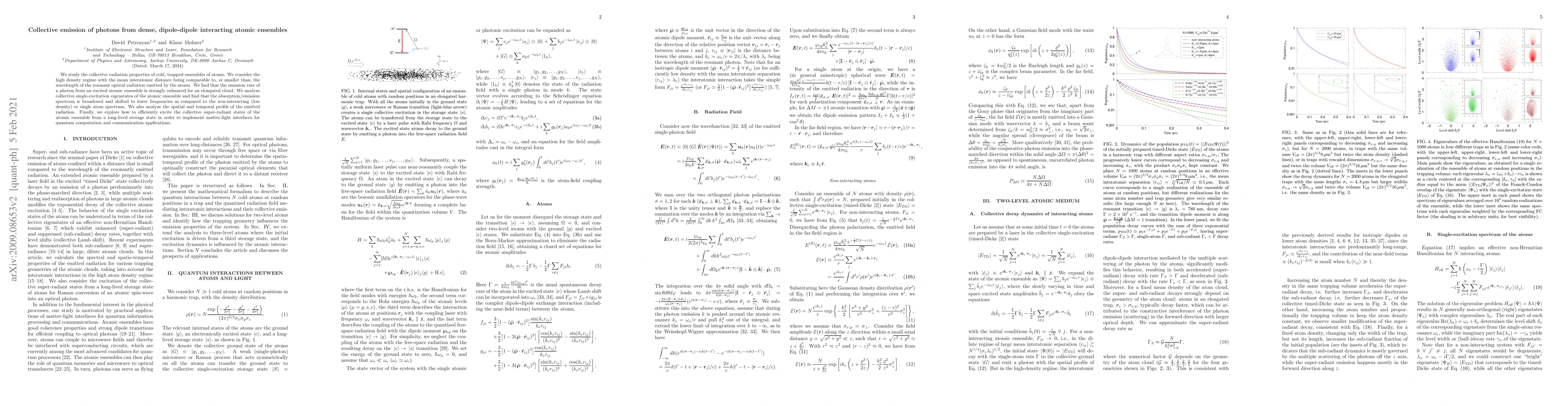 This paper investigates the collective photon emission from dense, interacting atomic ensembles, finding significant enhancement in emission rates for elongated clouds. It reveals broadened and frequency-shifted absorption/emission spectra and analyzes the spatial and temporal profiles of the emitted radiation, with implications for quantum computation and communication.