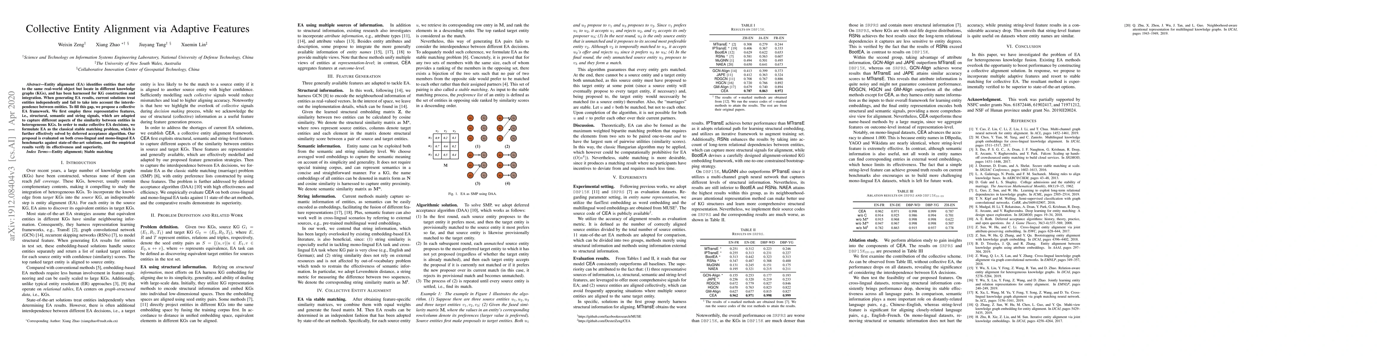 This paper proposes a collective entity alignment framework that considers interdependencies between entities by adapting structural, semantic, and string features. It formulates entity alignment as a stable matching problem solved via a deferred acceptance algorithm, demonstrating superior performance over state-of-the-art methods in both cross-lingual and mono-lingual benchmarks.